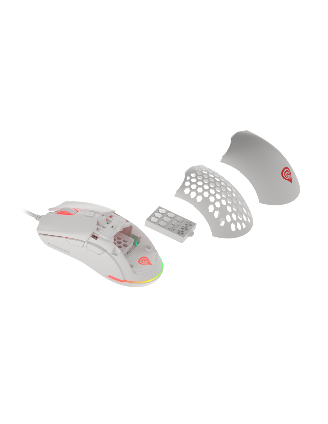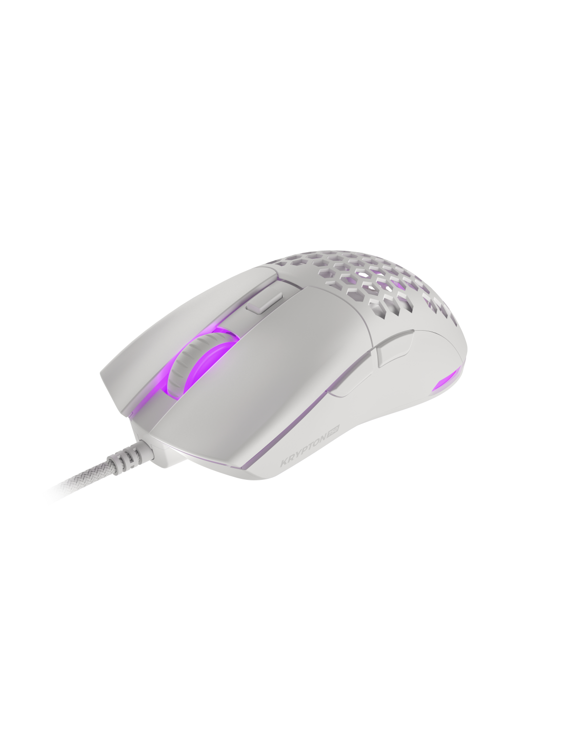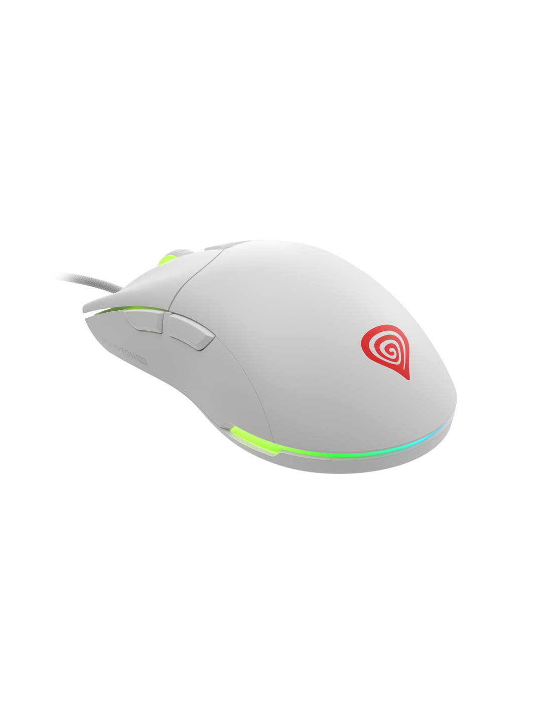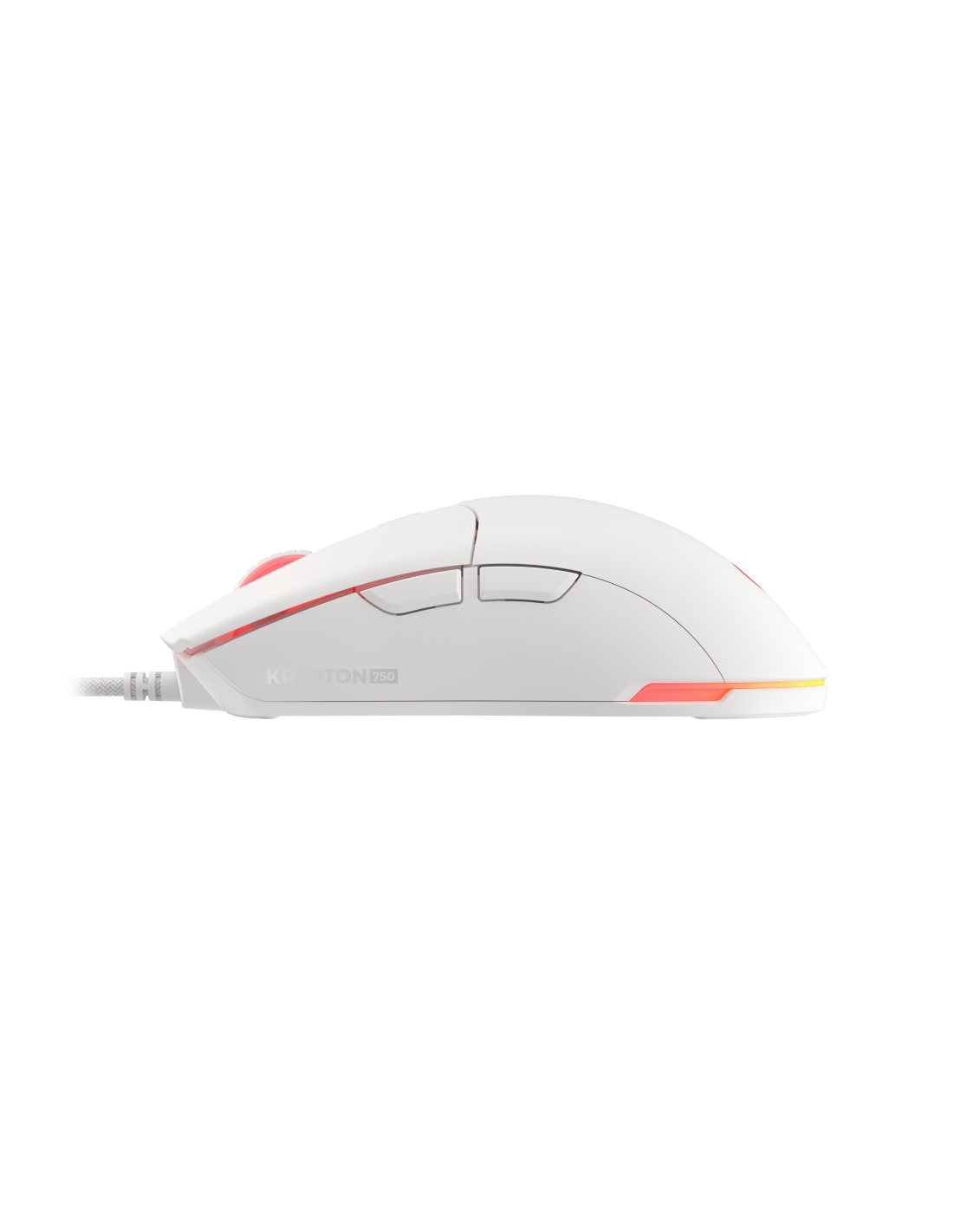 GENESIS Krypton 750. Factor de forma: mano derecha. Tecnología de detección de movimientos: Óptico, Interfaz del dispositivo: USB tipo A, Resolución de movimiento: 2000 DPI, Velocidad de cuadro: 8000 pps, Tipo de botones: Botones presionados, Cantidad de botones: 6, Tipo de desplazamiento: Rueda, Aceleración (máx.): 35 G. Iluminación de color: Multi. Fuente de energía: Cable. Color del producto: Blanco