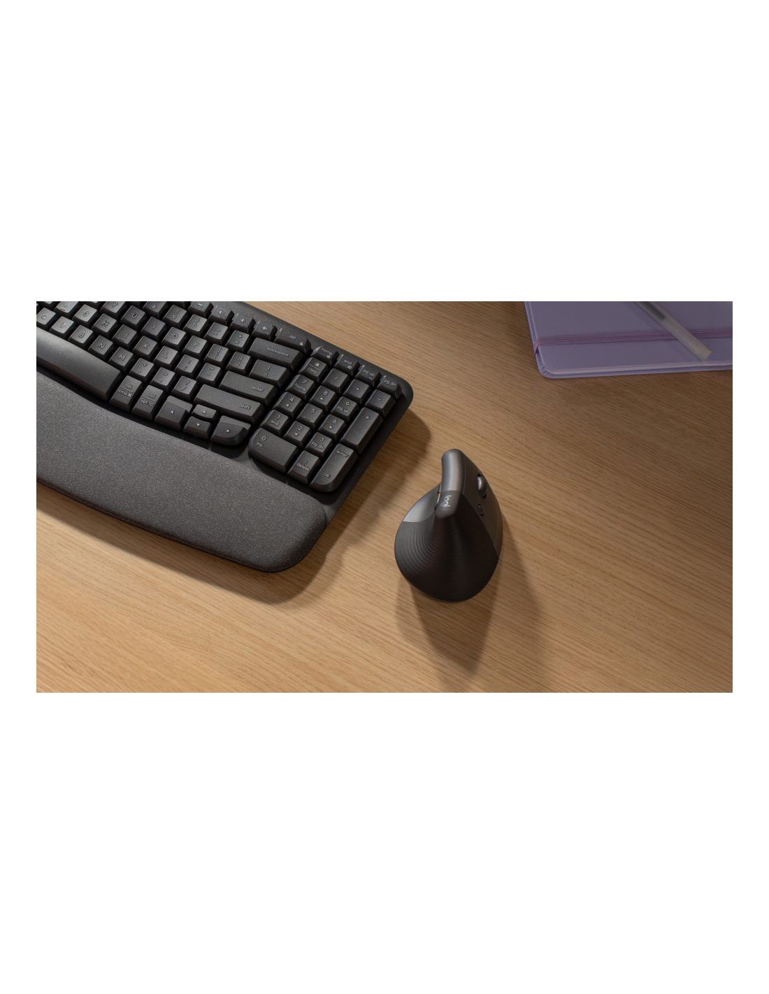Logitech Lift. Factor de forma: mano derecha, Diseño vertical. Tecnología de detección de movimientos: Óptico, Interfaz del dispositivo: RF Wireless + Bluetooth, Resolución de movimiento: 4000 DPI, Tipo de botones: Botones presionados, Cantidad de botones: 4, Tipo de desplazamiento: Rueda. Fuente de energía: Baterías. Color del producto: Grafito