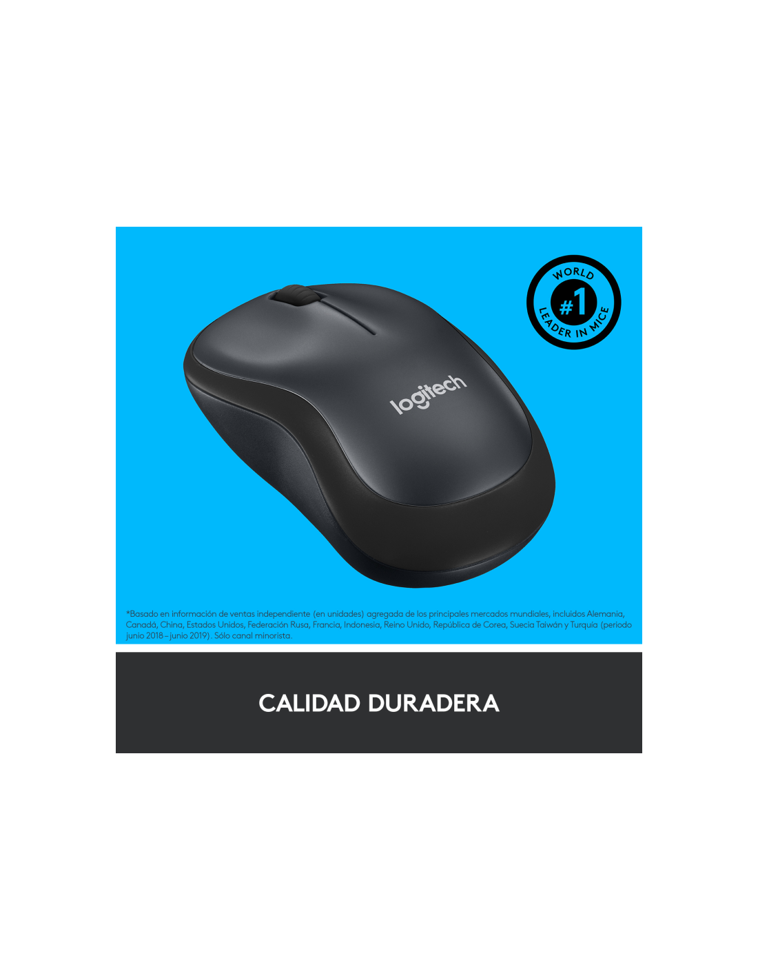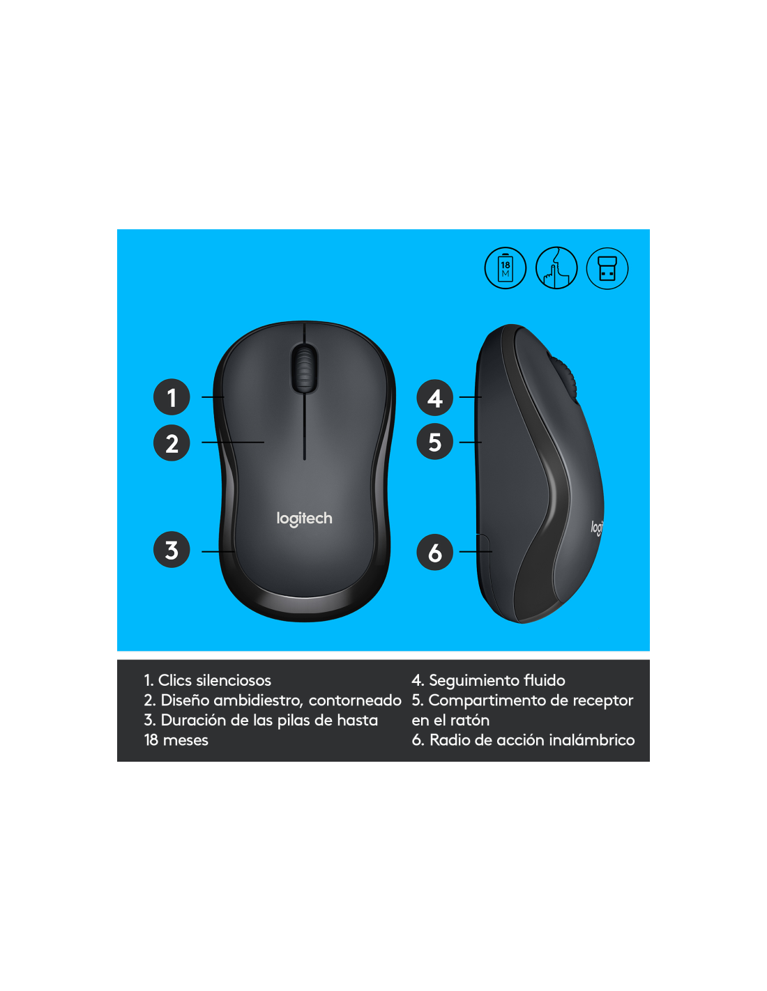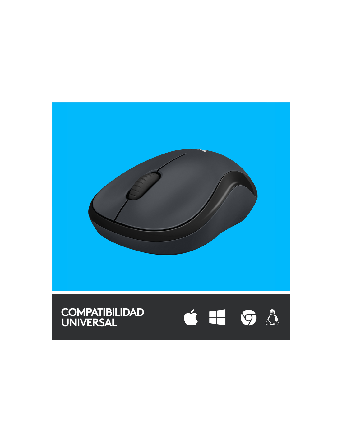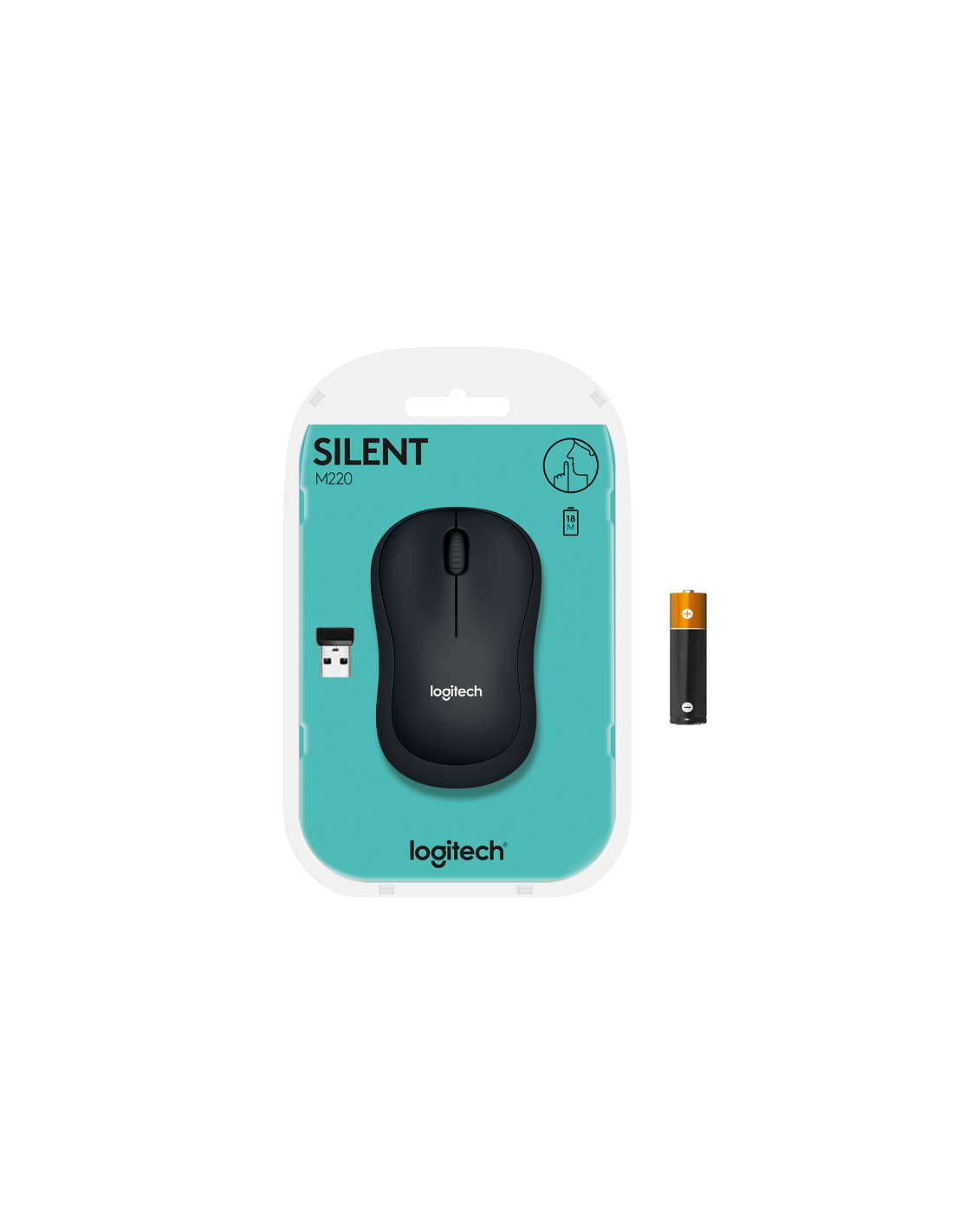 Logitech M220 Silent. Factor de forma: Ambidextro. Tecnología de detección de movimientos: Óptico, Interfaz del dispositivo: RF inalámbrico, Resolución de movimiento: 1000 DPI, Tipo de botones: Botones presionados, Cantidad de botones: 3, Tipo de desplazamiento: Rueda. Fuente de energía: Baterías. Color del producto: Carbón vegetal