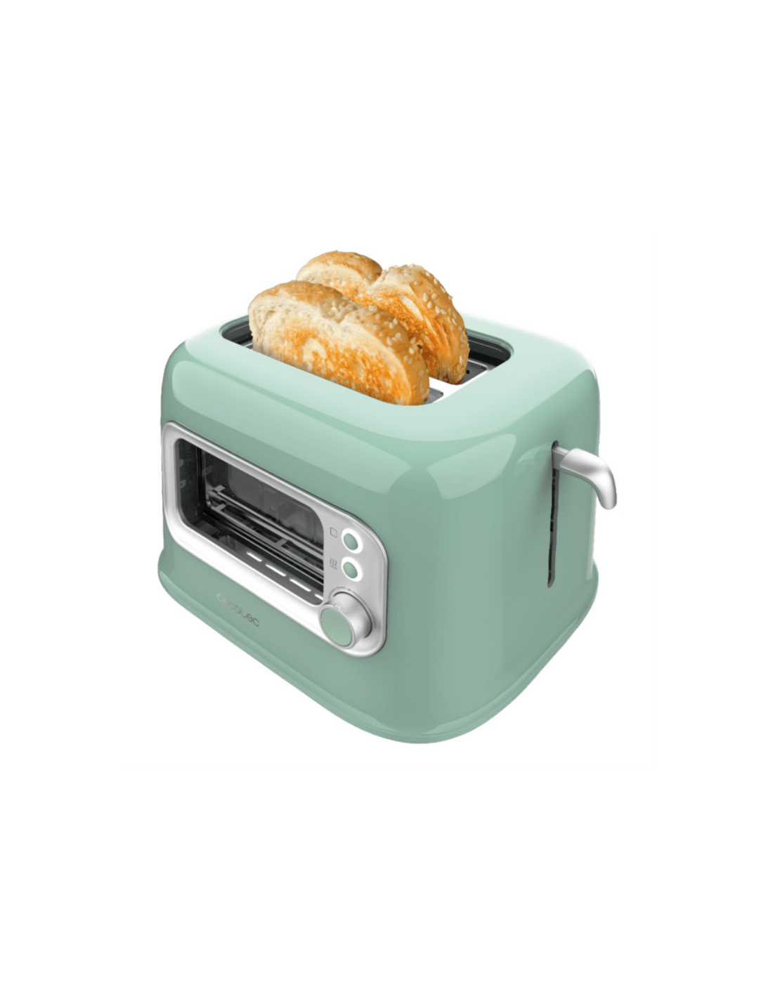 Cecotec RetroVision Green. Número de rebanadas: 2 rebanada(s), Color del producto: Verde claro, Acero inoxidable, Tipo de control: Botones, Nivel, Giratorio. Potencia: 700 W, Voltaje de entrada AC: 220 - 240 V, Frecuencia de entrada AC: 50/60 Hz. Cantidad por paquete: 1 pieza(s)