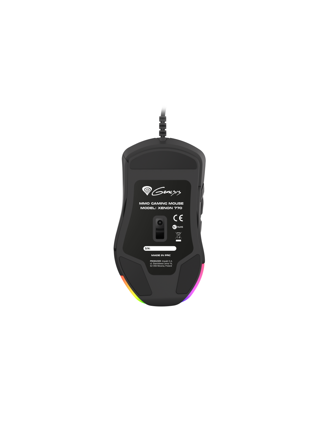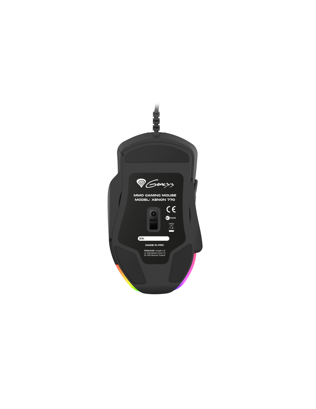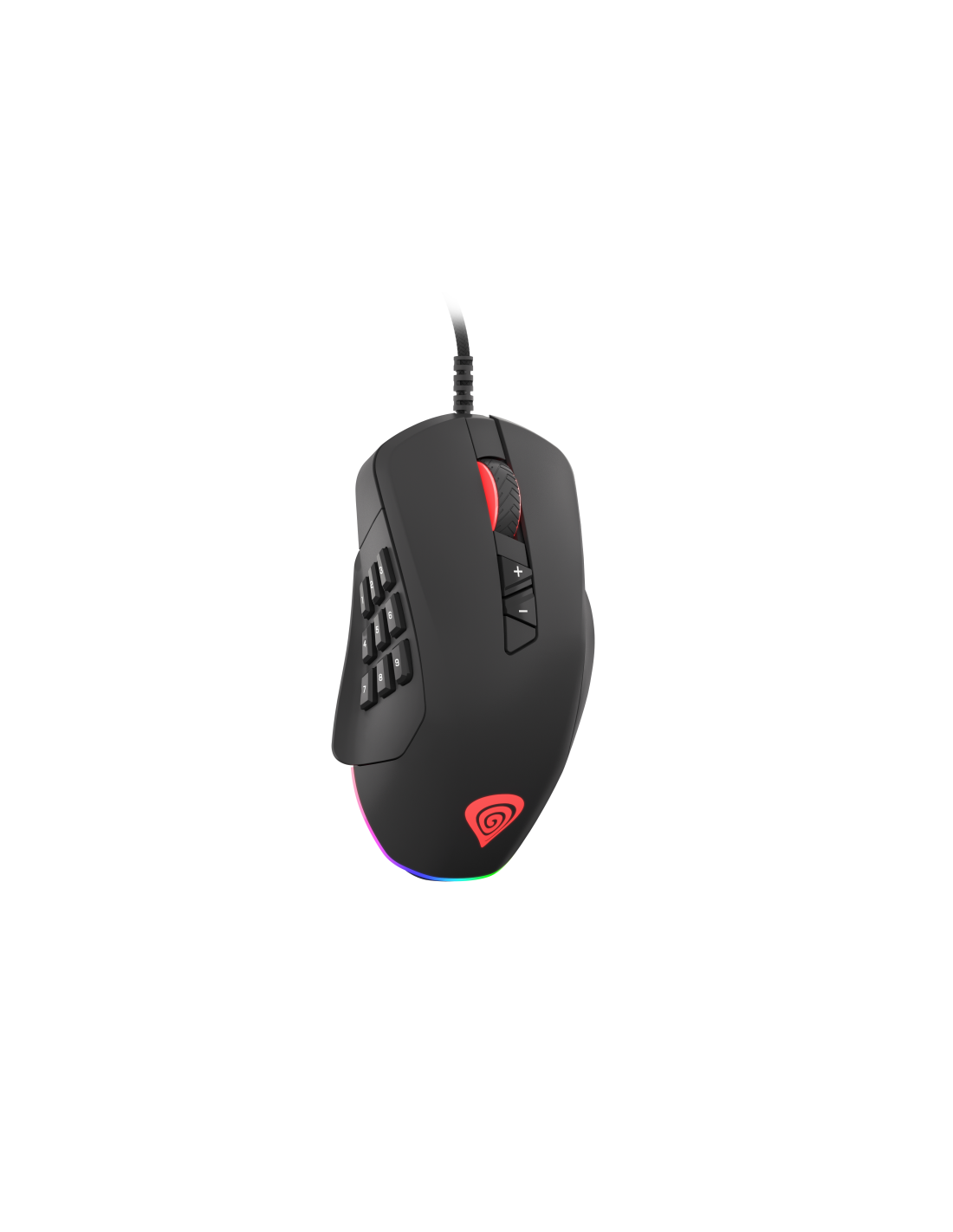 GENESIS Xenon 770. Factor de forma: mano derecha. Tecnología de detección de movimientos: Óptico, Interfaz del dispositivo: USB tipo A, Resolución de movimiento: 10200 DPI, Velocidad de cuadro: 8000 pps, Tipo de botones: Botones presionados, Cantidad de botones: 14, Tipo de desplazamiento: Rueda, Aceleración (máx.): 30 G. Fuente de energía: Cable. Color del producto: Negro