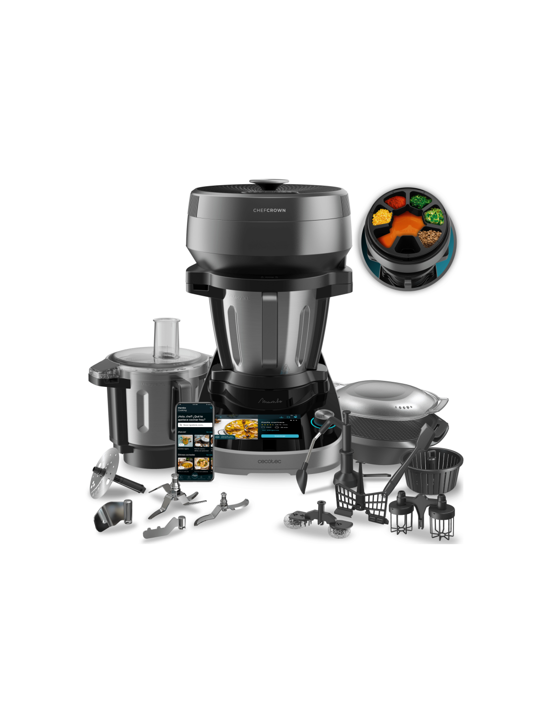 Cecotec Mambo CooKing Total Gourmet. Capacidad del tazón: 4,5 L, Temperatura de cocción (máx.): 180 °C, Diagonal de la pantalla: 17,8 cm (7"). Color del producto: Acero inoxidable, Tipo de control: Tocar, Material del tazón: Acero inoxidable. Potencia máxima: 2200 W, Voltaje de entrada AC: 220-240 V. Contenido del paquete: Robot de cocina, Jarra de acero inoxidable Unique XL, Dispensador automático de alimentos...