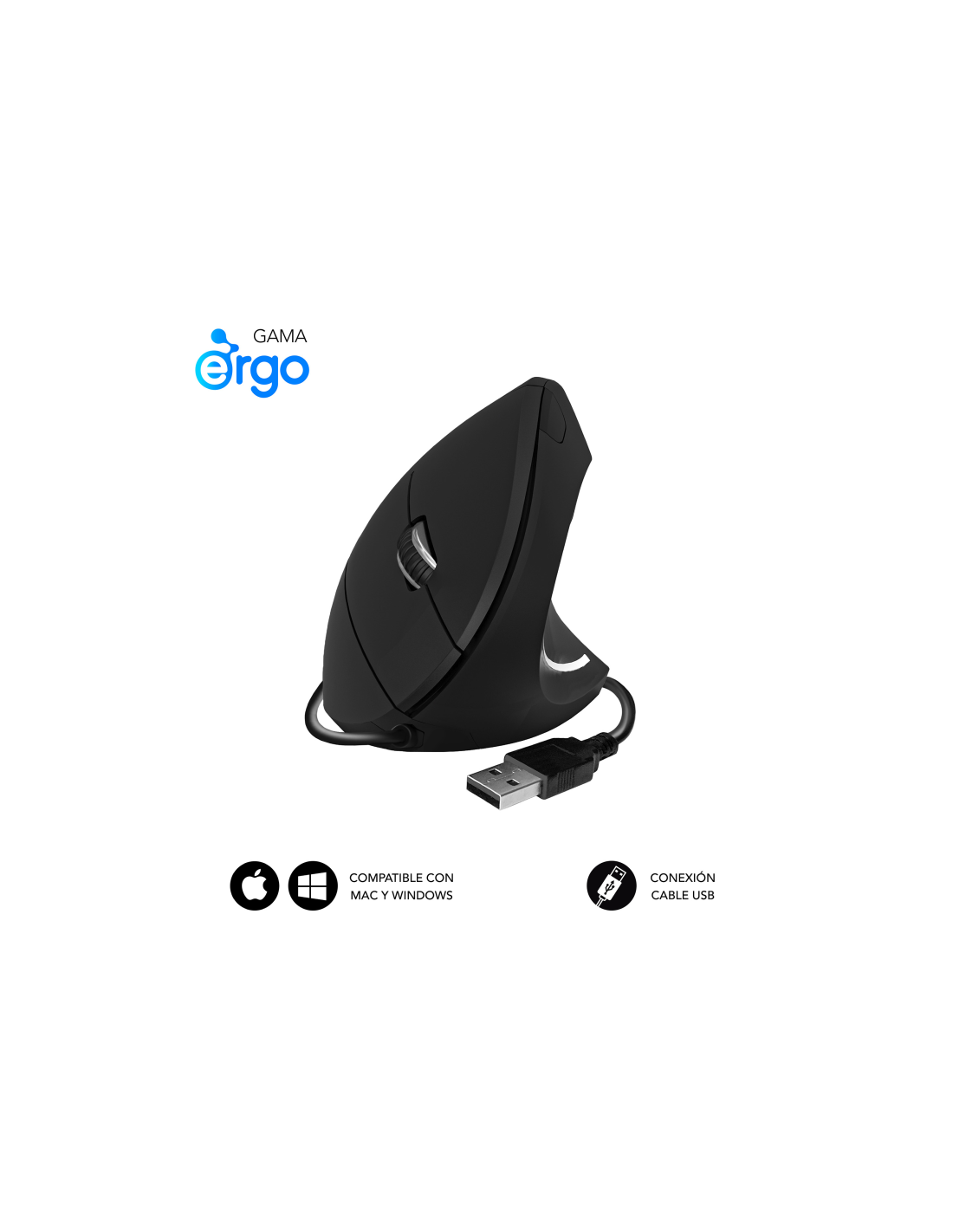 SUBBLIM Ratón GLIDE VERTICAL ERGO WIRED MOUSE BLACK. Factor de forma: mano derecha, Diseño vertical. Tecnología de detección de movimientos: Óptico, Interfaz del dispositivo: USB tipo A, Resolución de movimiento: 1600 DPI, Tipo de botones: Botones presionados, Cantidad de botones: 6, Tipo de desplazamiento: Rueda. Fuente de energía: Cable. Color del producto: Negro