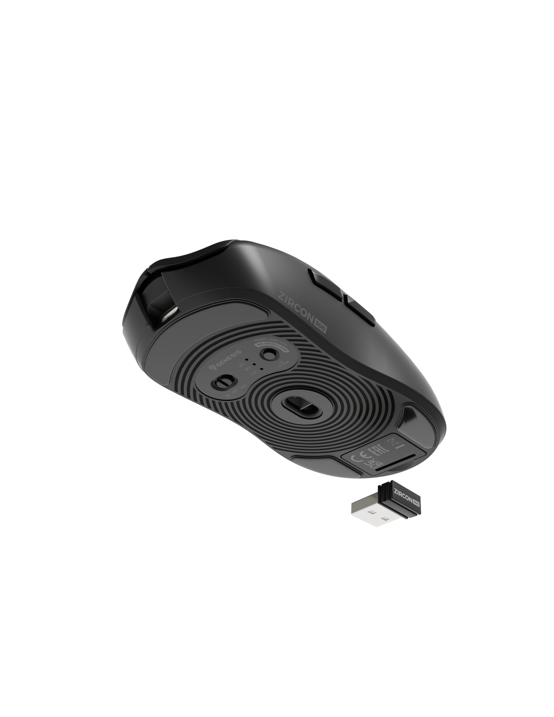 GENESIS Zircon 500. Factor de forma: mano derecha. Tecnología de detección de movimientos: Óptico, Interfaz del dispositivo: RF Wireless + Bluetooth + USB Type-C, Resolución de movimiento: 10000 DPI, Velocidad de cuadro: 4600 pps, Tipo de botones: Botones presionados, Cantidad de botones: 6, Tipo de desplazamiento: Rueda, Aceleración (máx.): 20 G. Fuente de energía: Baterías/Cable. Color del producto: Negro