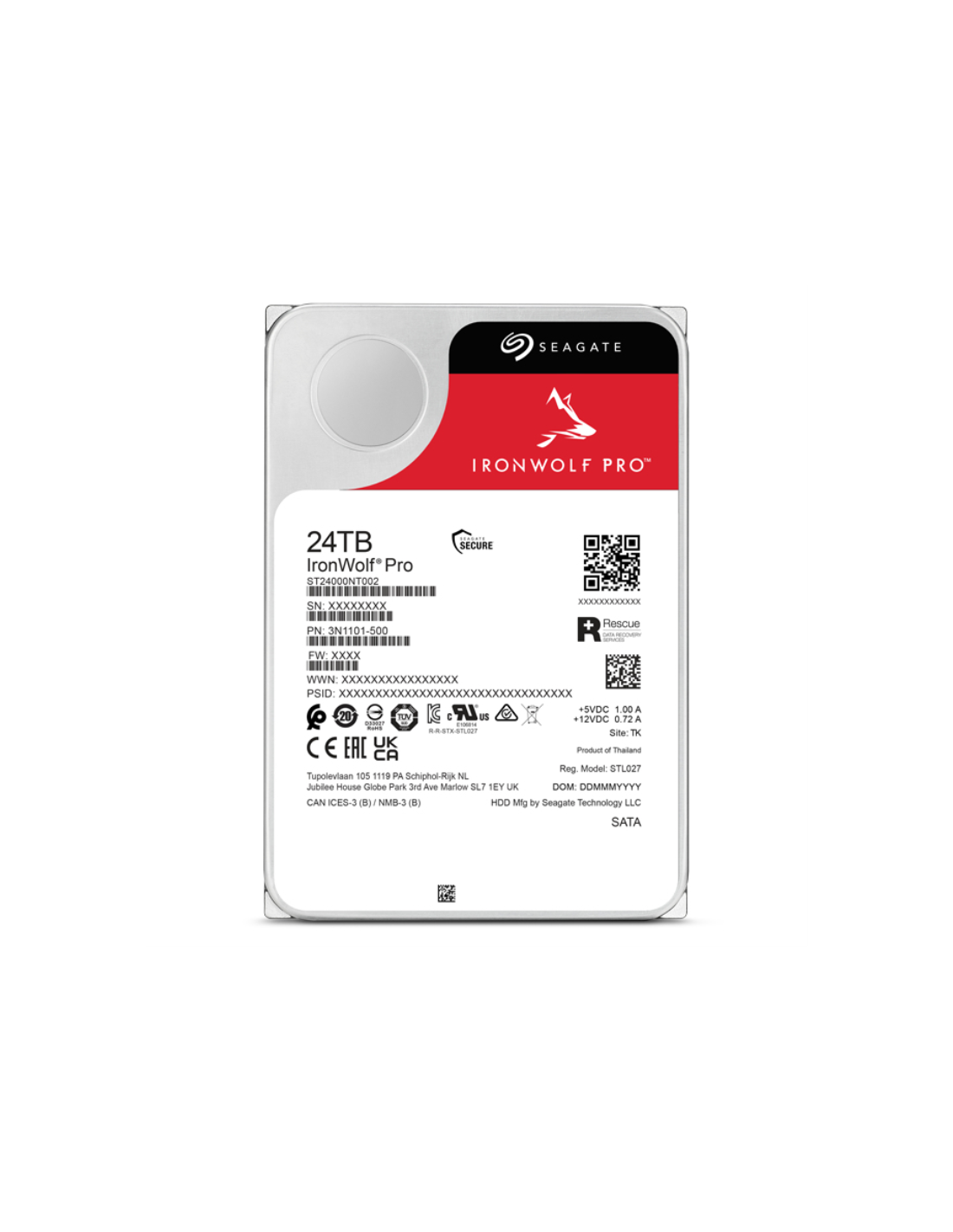 Seagate IronWolf Pro ST24000NT002. Capacidad del HDD: 24 TB, Velocidad de rotación del HDD: 7200 RPM, Tamaño de unidad de almacenamiento de búfer: 512 MB, Tamaño del HDD: 3.5", Interfaz: Serial ATA III