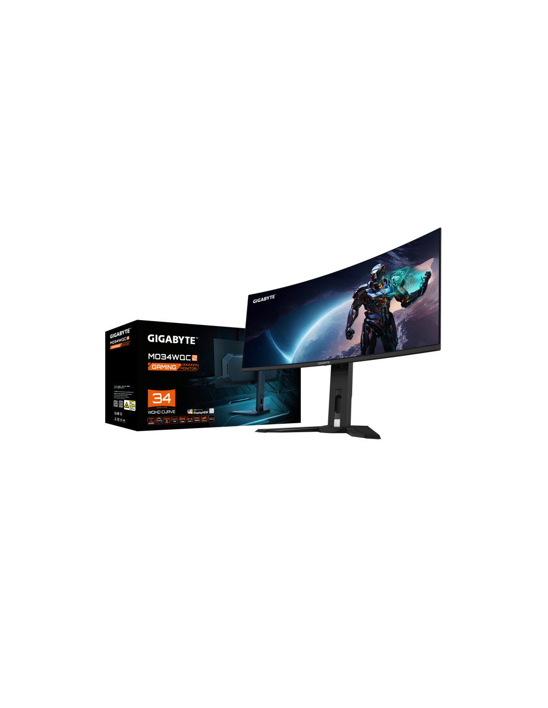 GIGABYTE Monitor de juegos curvo OLED WQHD MO34WQC2 de 34" - 3440 x 1440, 240Hz, 0.03ms, KVM, 250 cd/m², FreeSync Premium Pro, DisplayHDR True Black 400, HDMI 2.1, Displayport 1.4. Diagonal de la pantalla: 86,4 cm (34"), Resolución de la pantalla: 3440 x 1440 Pixeles, Tipo HD: Wide Quad HD, Tecnología de visualización: OLED, Tiempo de respuesta: 0,03 ms, Relación de aspecto nativa: 21:9, Ángulo de visión, horizontal: 178°, Ángulo de visión, vertical: 178°. Altavoces incorporados. Conector USB incorporado. m