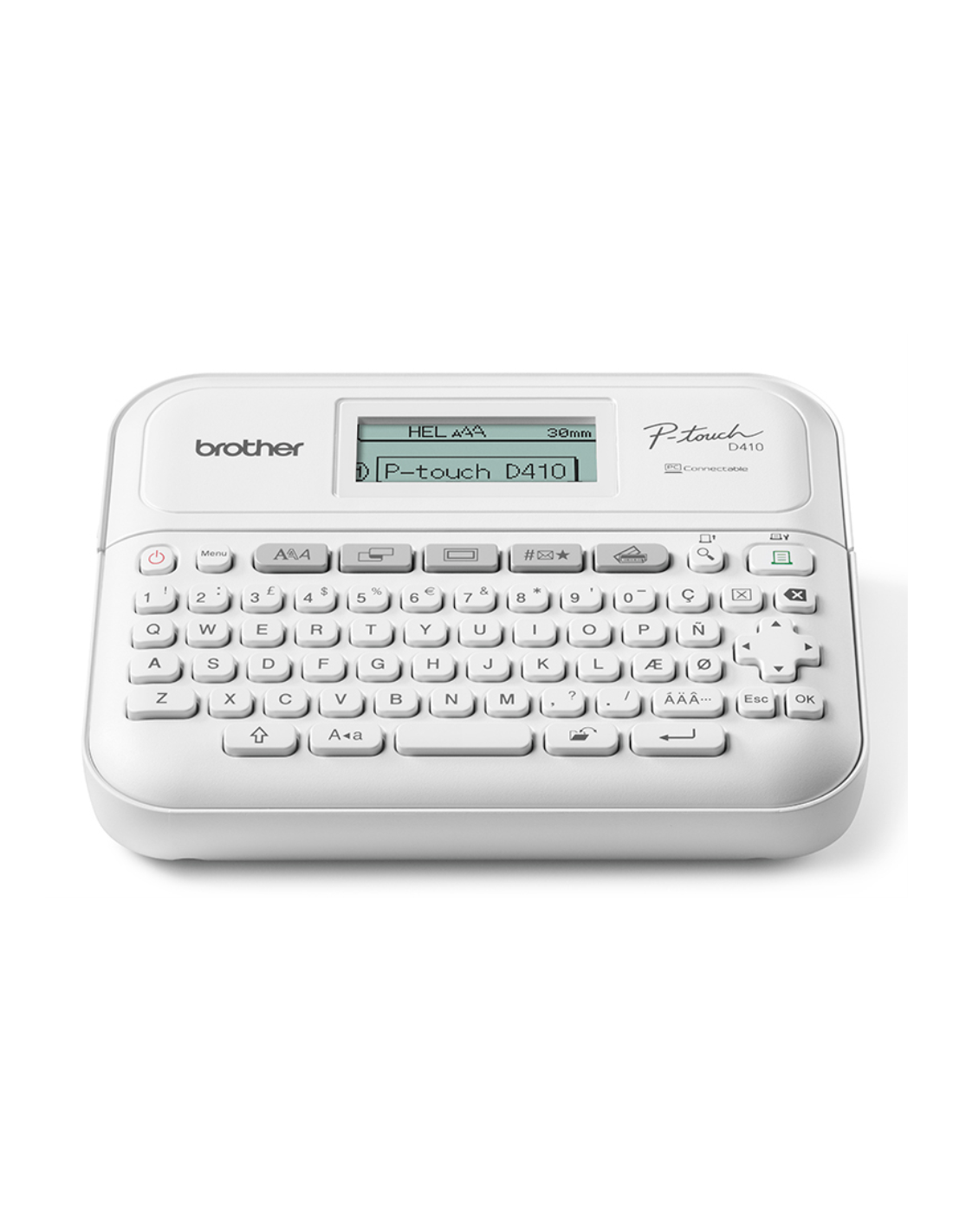 Brother PT-D410. Tecnología de impresión: Transferencia térmica, Resolución máxima: 180 x 180 DPI, Velocidad de impresión: 20 mm/s. Tecnología de conectividad: Alámbrico, Puerto USB. Diseño de teclado: QWERTY. Tipo de cinta: TZe. Color del producto: Blanco