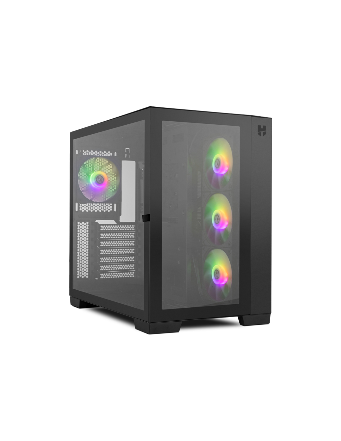 Disponible en dos colores, blanco o negro, con una impresionante estética, la Nox Hummer Astra presenta un diseño gaming minimalista. Experimenta un espectáculo visual de máximo nivel con sus doble cristal templado, uno en su frontal y otro en el lateral, quedando la configuración totalmente a la vista, disfrutando como nunca de la iluminación ARGB, gracias al controlador ARGB con mando a distancia que trae incluido.