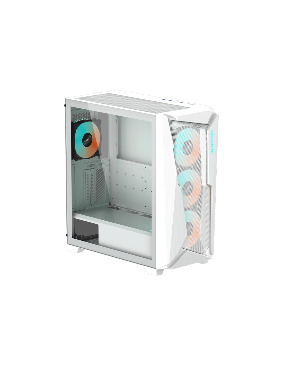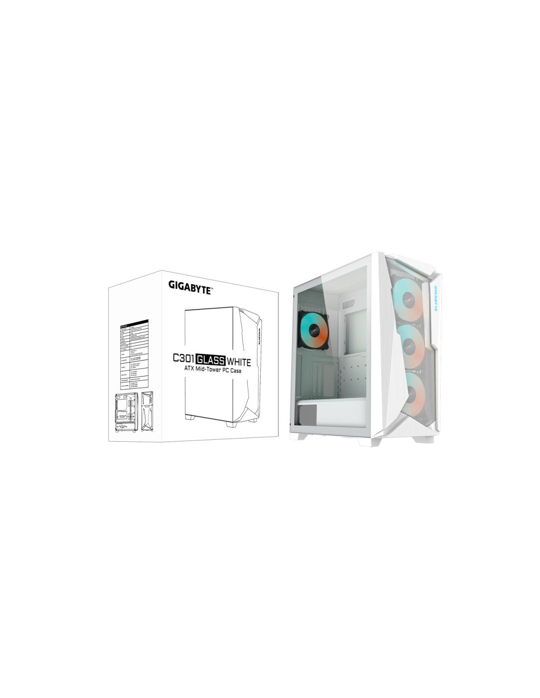 Gigabyte C301GW. Factor de forma: Midi Tower, Tipo: PC, Color del producto: Blanco. Ventiladores frontales instalados: 3x 120 mm, Ventiladores traseros instalados: 1x 120 mm. Tamaños de disco duro soportados: 2.5,3.5", Factor de forma de disco SSD: 2.5". Ancho: 220 mm, Profundidad: 473 mm, Altura: 486 mm. Ancho del paquete: 282 mm, Profundidad del paquete: 530 mm, Altura del paquete: 530 mm