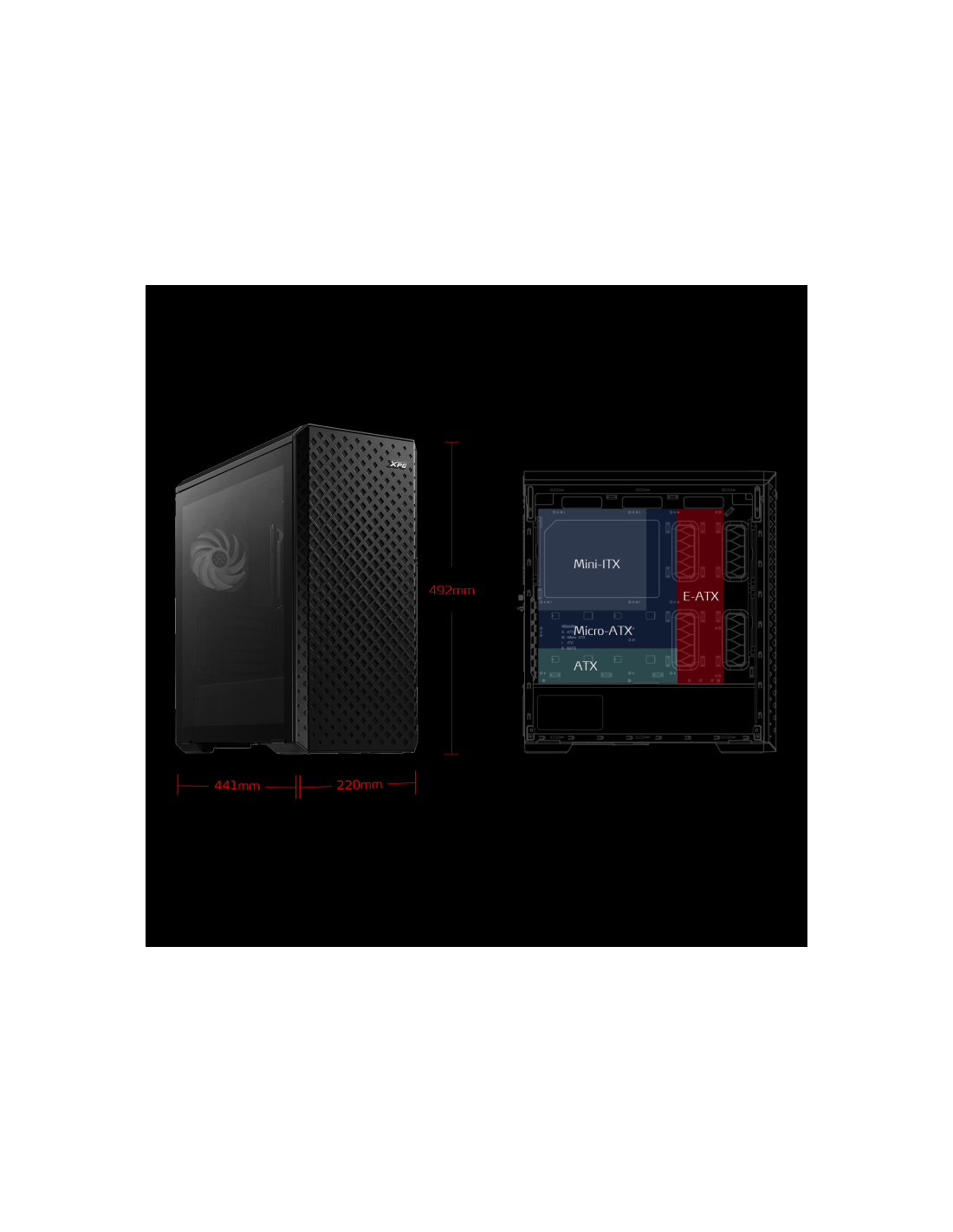 XPG DEFENDER PRO Torre Midi Negra. Factor de forma: Escritorio, Tipo: PC, Color del producto: Negro. Ventiladores frontales instalados: 2x 120 mm, Ventiladores traseros instalados: 1x 120 mm, Tamaños compatibles con el radiador frontal: 240,280,360 mm. Tamaños de disco duro soportados: 2.5,3.5". Ancho: 220 mm, Profundidad: 441 mm, Altura: 492 mm