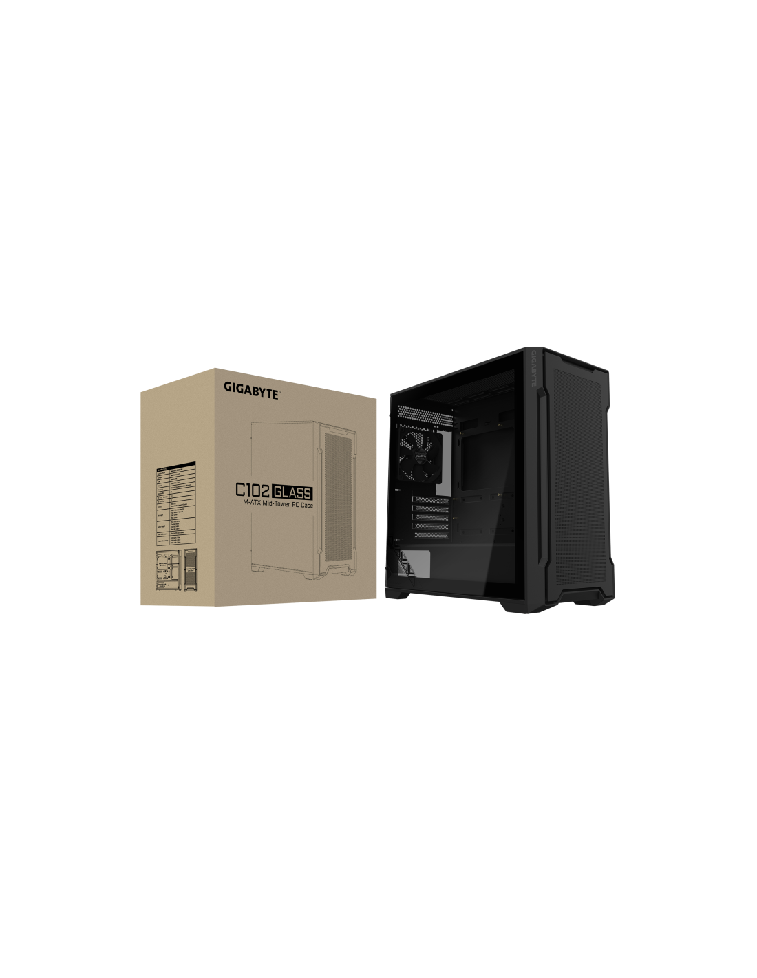 GIGABYTE C102 GLASS. Factor de forma: Midi Tower, Tipo: PC, Color del producto: Negro. Ubicación de fuente de alimentación: Fondo. Ventiladores frontales instalados: 1x 120 mm, Diámetro de ventiladores frontales soportados: 120,140 mm, Ventiladores traseros instalados: 1x 120 mm. Tamaños de disco duro soportados: 2.5,3.5", Factor de forma de disco SSD: 2.5". Ancho: 210 mm, Profundidad: 450 mm, Altura: 450 mm