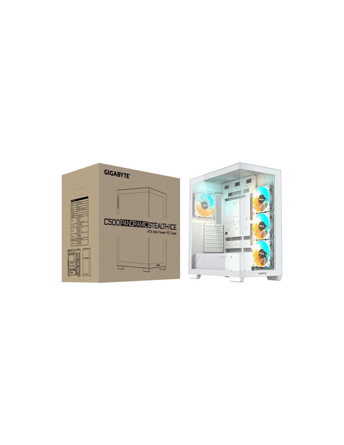 GIGABYTE C500 PANORAMIC STEALTH. Factor de forma: Midi Tower, Tipo: PC, Color del producto: Blanco. Ubicación de fuente de alimentación: Fondo, Factores de forma de la fuente de alimentación compatibles: ATX. Diámetro de ventiladores frontales soportados: 120,140 mm, Ventiladores laterales instalados: 3x 120 mm, Diámetro de ventiladores secundarios soportados: 120 mm. Tamaños de disco duro soportados: 2.5,3.5", Factor de forma de disco SSD: 2.5". Ancho: 235 mm, Profundidad: 430 mm, Altura: 501 mm