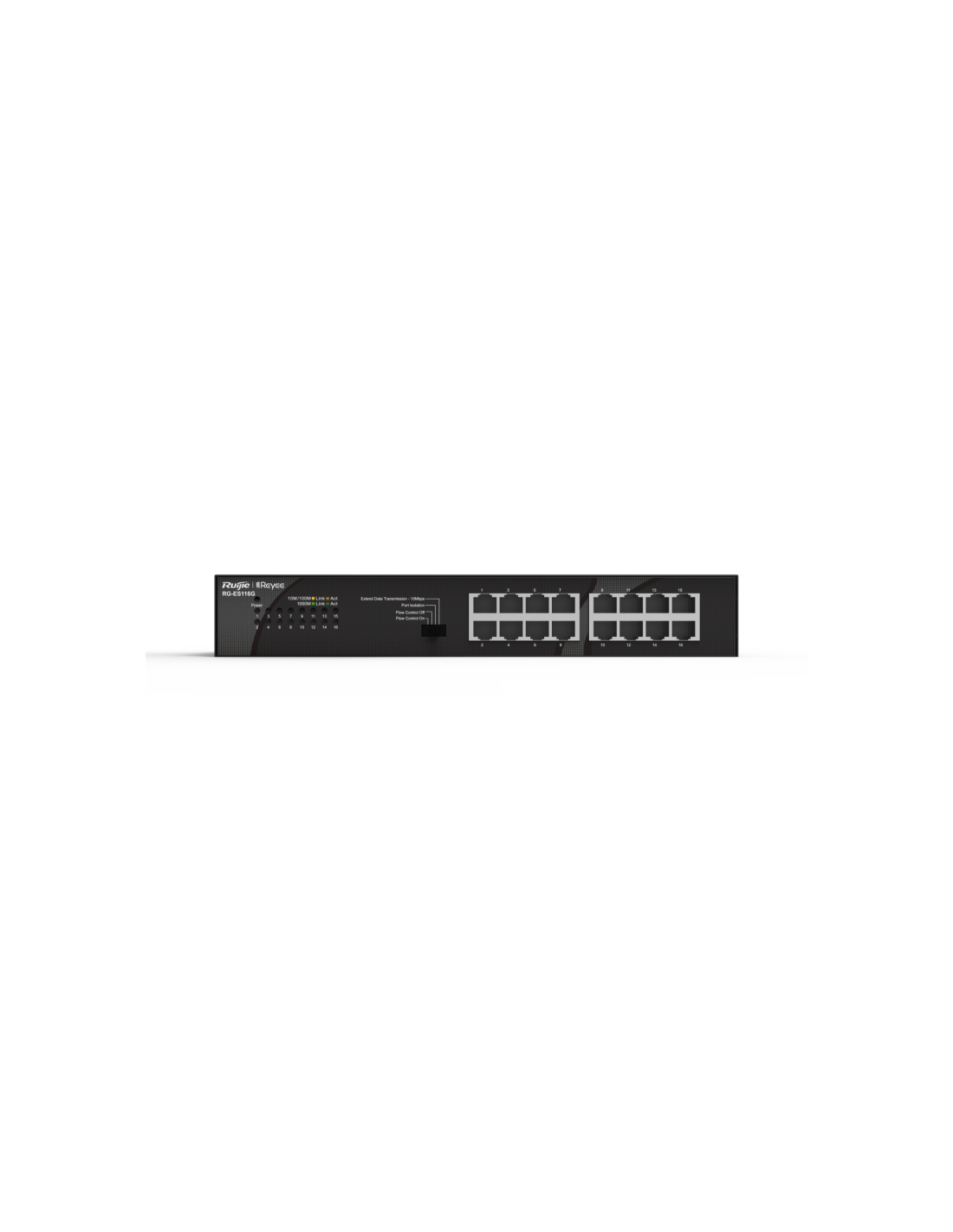 Ruijie Networks RG-ES116G. Tipo de interruptor: No administrado. Puertos tipo básico de conmutación RJ-45 Ethernet: Gigabit Ethernet (10/100/1000), Cantidad de puertos básicos de conmutación RJ-45 Ethernet: 16. Tabla de direcciones MAC: 8000 entradas, Capacidad de conmutación: 32 Gbit/s