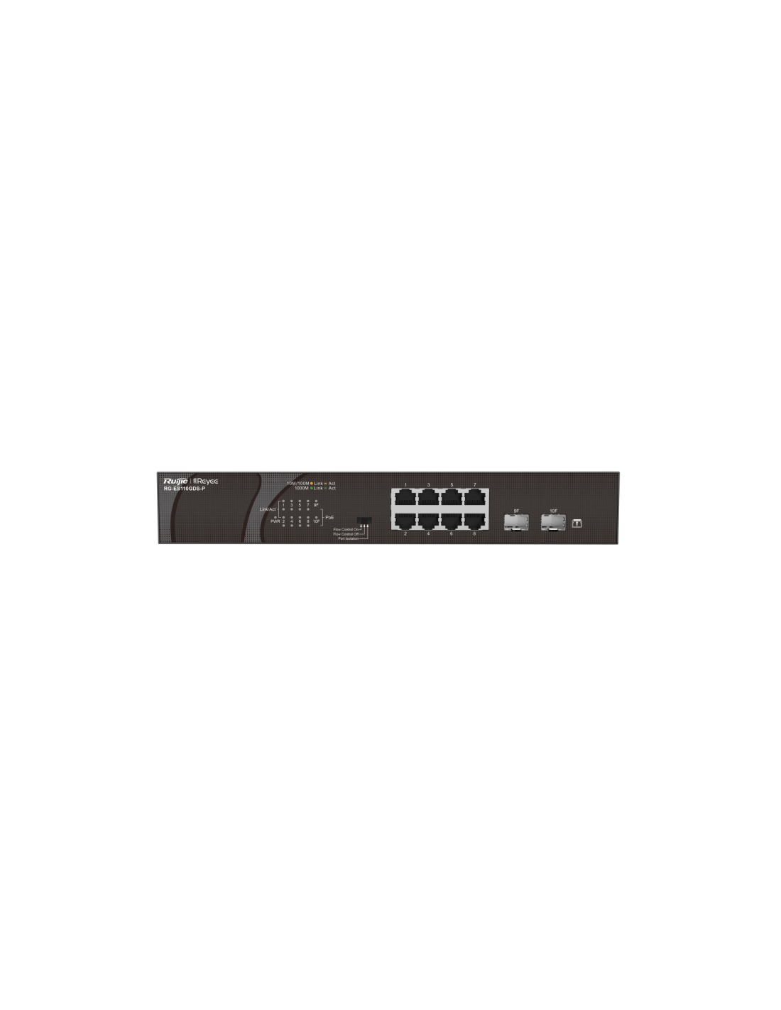 Ruijie Networks RG-ES110GDS-P. Tipo de interruptor: No administrado. Puertos tipo básico de conmutación RJ-45 Ethernet: Gigabit Ethernet (10/100/1000), Cantidad de puertos básicos de conmutación RJ-45 Ethernet: 8, Número de módulos SFP instalados: 2. Tabla de direcciones MAC: 4000 entradas, Capacidad de conmutación: 20 Gbit/s. Energía sobre Ethernet (PoE). Montaje en rack