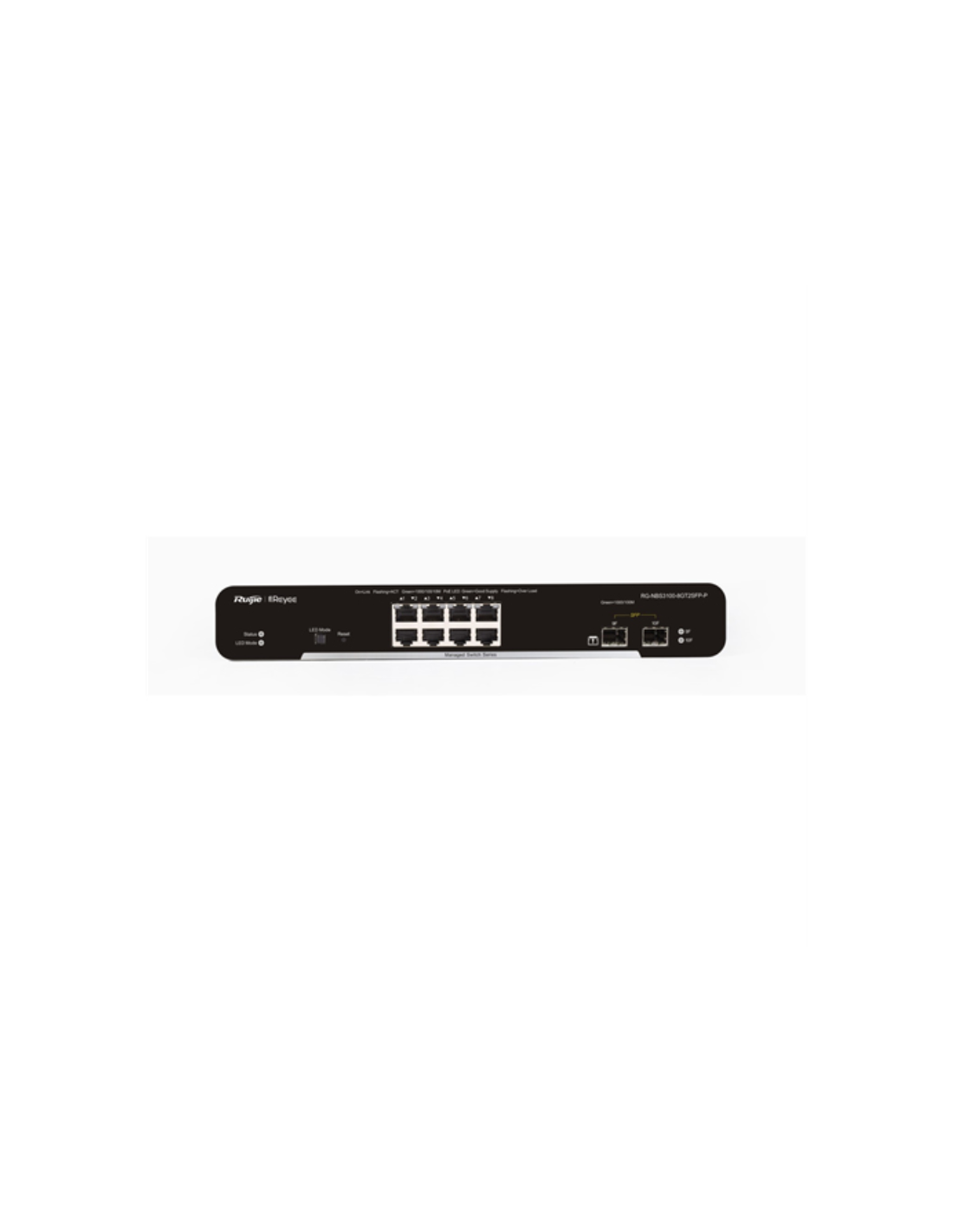 Ruijie Networks RG-NBS3100-8GT2SFP-P. Tipo de interruptor: Gestionado, Capa del interruptor: L2. Puertos tipo básico de conmutación RJ-45 Ethernet: Gigabit Ethernet (10/100/1000), Cantidad de puertos básicos de conmutación RJ-45 Ethernet: 8, Número de módulos SFP instalados: 2. Tabla de direcciones MAC: 8000 entradas, Capacidad de conmutación: 20 Gbit/s. Estándares de red: IEEE 802.1D, IEEE 802.1s, IEEE 802.1w. Energía sobre Ethernet (PoE)