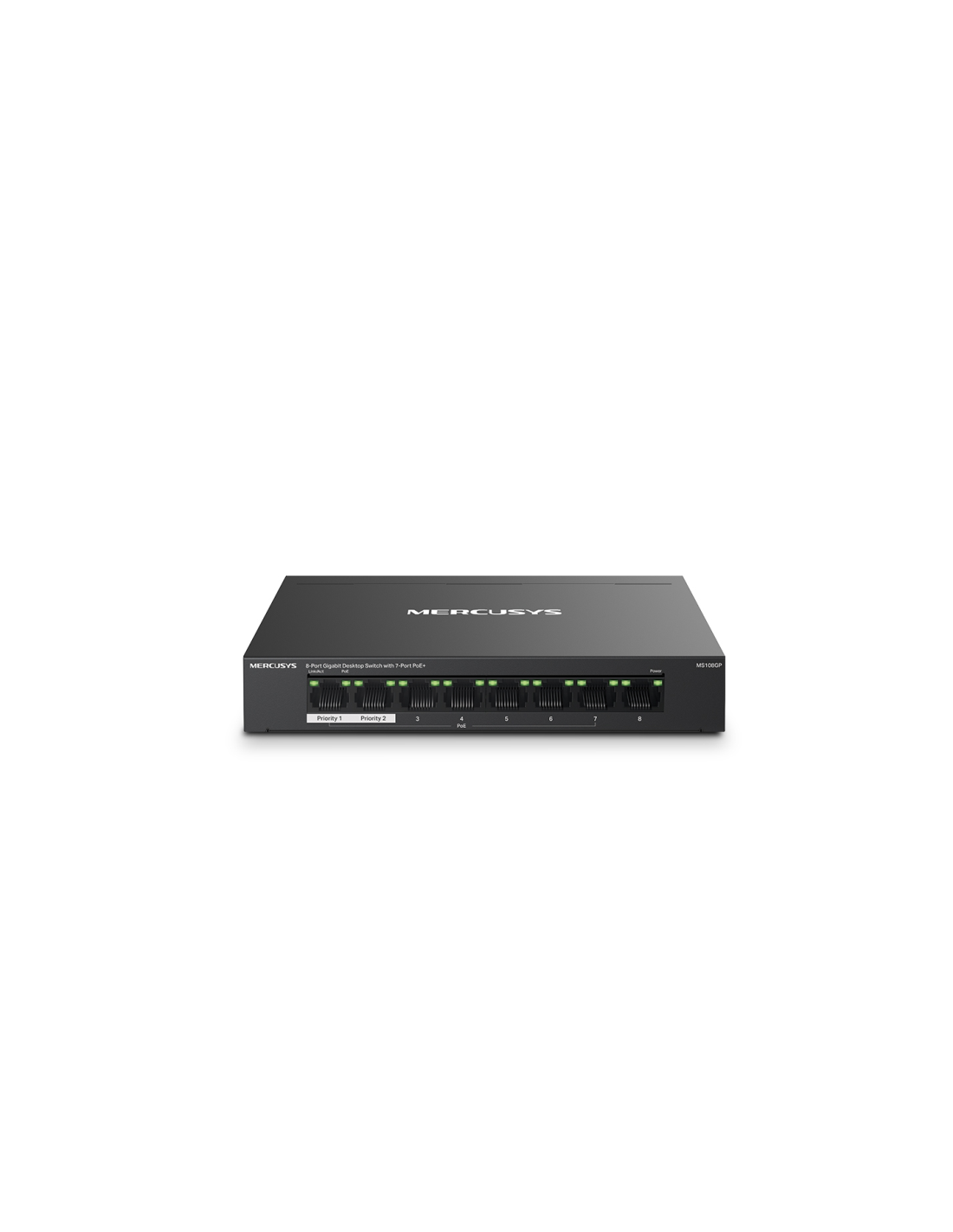 Mercusys MS108GP. Tipo de interruptor: Gestionado. Puertos tipo básico de conmutación RJ-45 Ethernet: Gigabit Ethernet (10/100/1000), Cantidad de puertos básicos de conmutación RJ-45 Ethernet: 8. Bidireccional completo (Full duplex). Tabla de direcciones MAC: 8000 entradas. Estándares de red: IEEE 802.3af, IEEE 802.3at, IEEE 802.3x. Energía sobre Ethernet (PoE). Montaje de pared