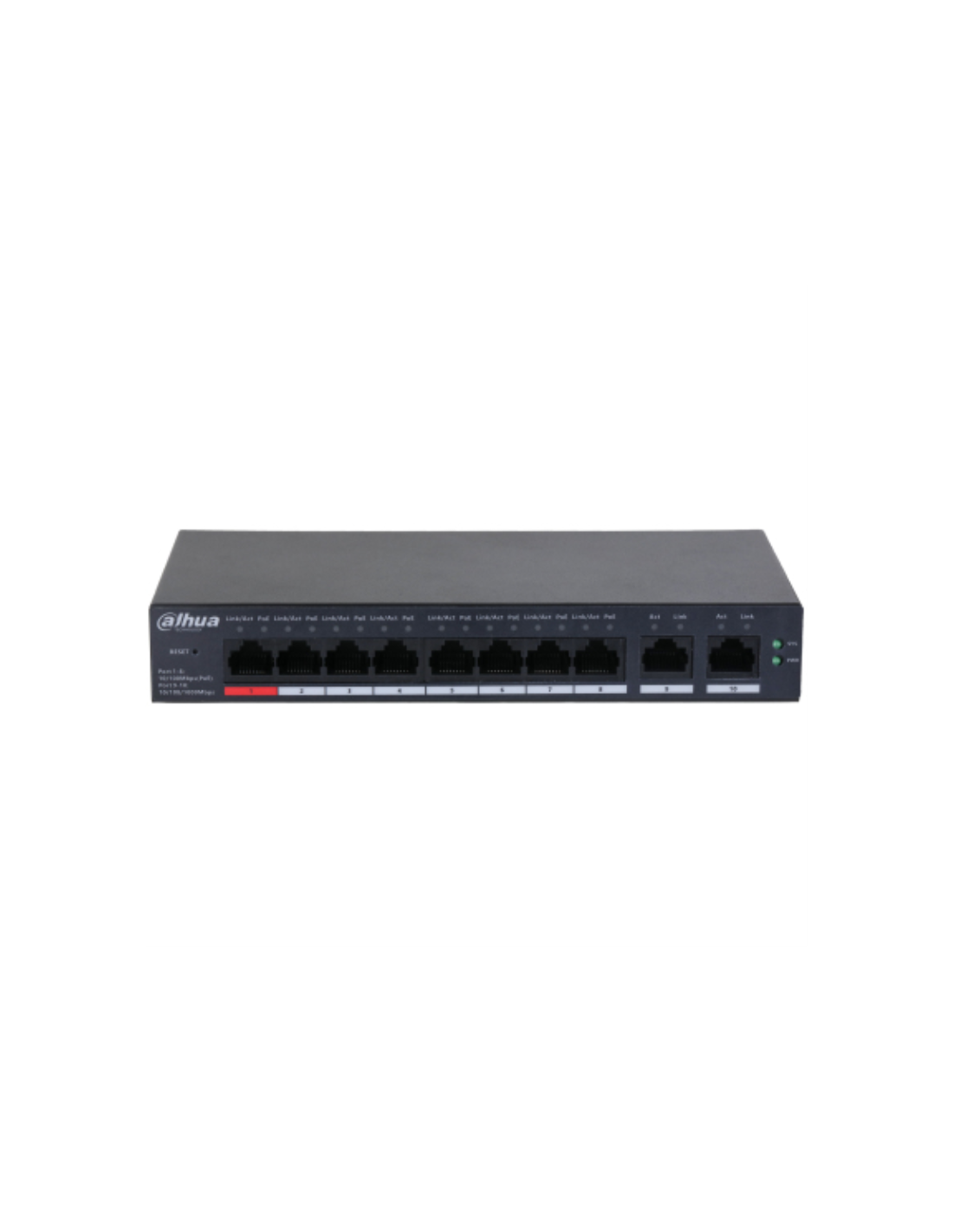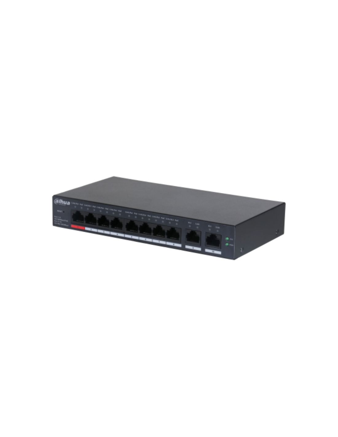 Dahua Technology DH-CS4010-8ET-110. Tipo de interruptor: Gestionado, Capa del interruptor: L2. Puertos tipo básico de conmutación RJ-45 Ethernet: Fast Ethernet (10/100), Cantidad de puertos básicos de conmutación RJ-45 Ethernet: 8. Tabla de direcciones MAC: 8000 entradas, Capacidad de conmutación: 5,6 Gbit/s. Estándares de red: IEEE 802.3, IEEE 802.3ab, IEEE 802.3af, IEEE 802.3at, IEEE 802.3bt, IEEE 802.3u, IEEE 802.3x. Voltaje de entrada DC: 54 V. Energía sobre Ethernet (PoE)