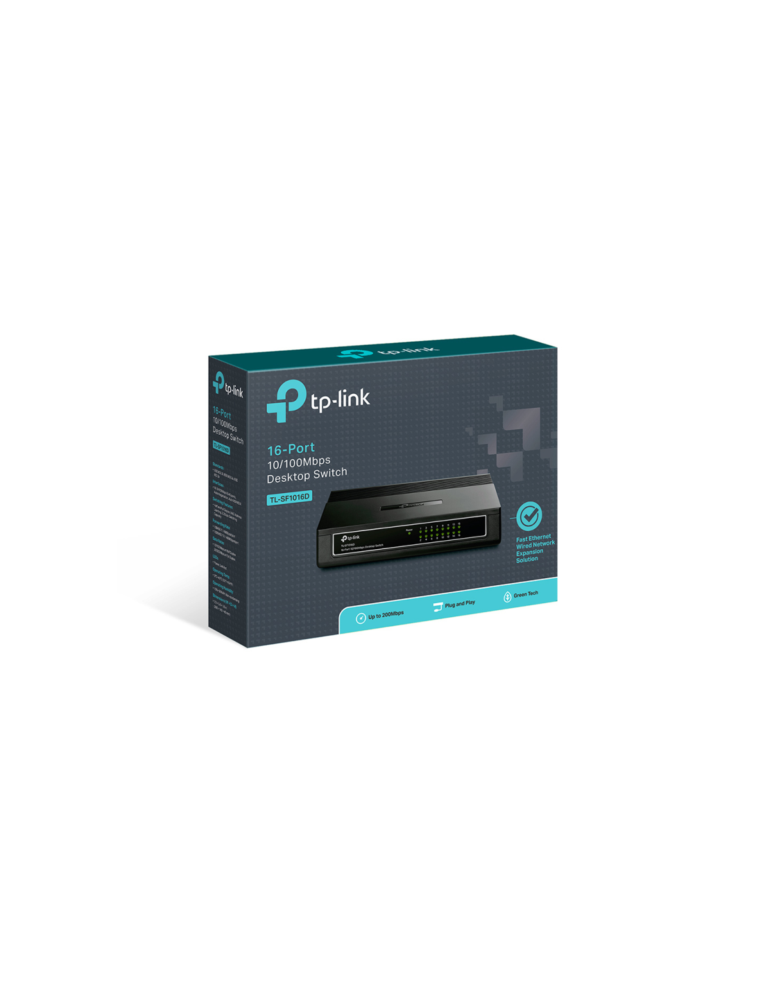 TP-Link TL-SF1016D. Tipo de interruptor: No administrado. Puertos tipo básico de conmutación RJ-45 Ethernet: Fast Ethernet (10/100), Cantidad de puertos básicos de conmutación RJ-45 Ethernet: 16. Bidireccional completo (Full duplex). Tabla de direcciones MAC: 2000 entradas, Capacidad de conmutación: 3,2 Gbit/s. Estándares de red: IEEE 802.3u, IEEE 802.3x. Voltaje de entrada DC: 9 V. Conector eléctrico: Toma de entrada de CC. Montaje de pared, Montaje en rack