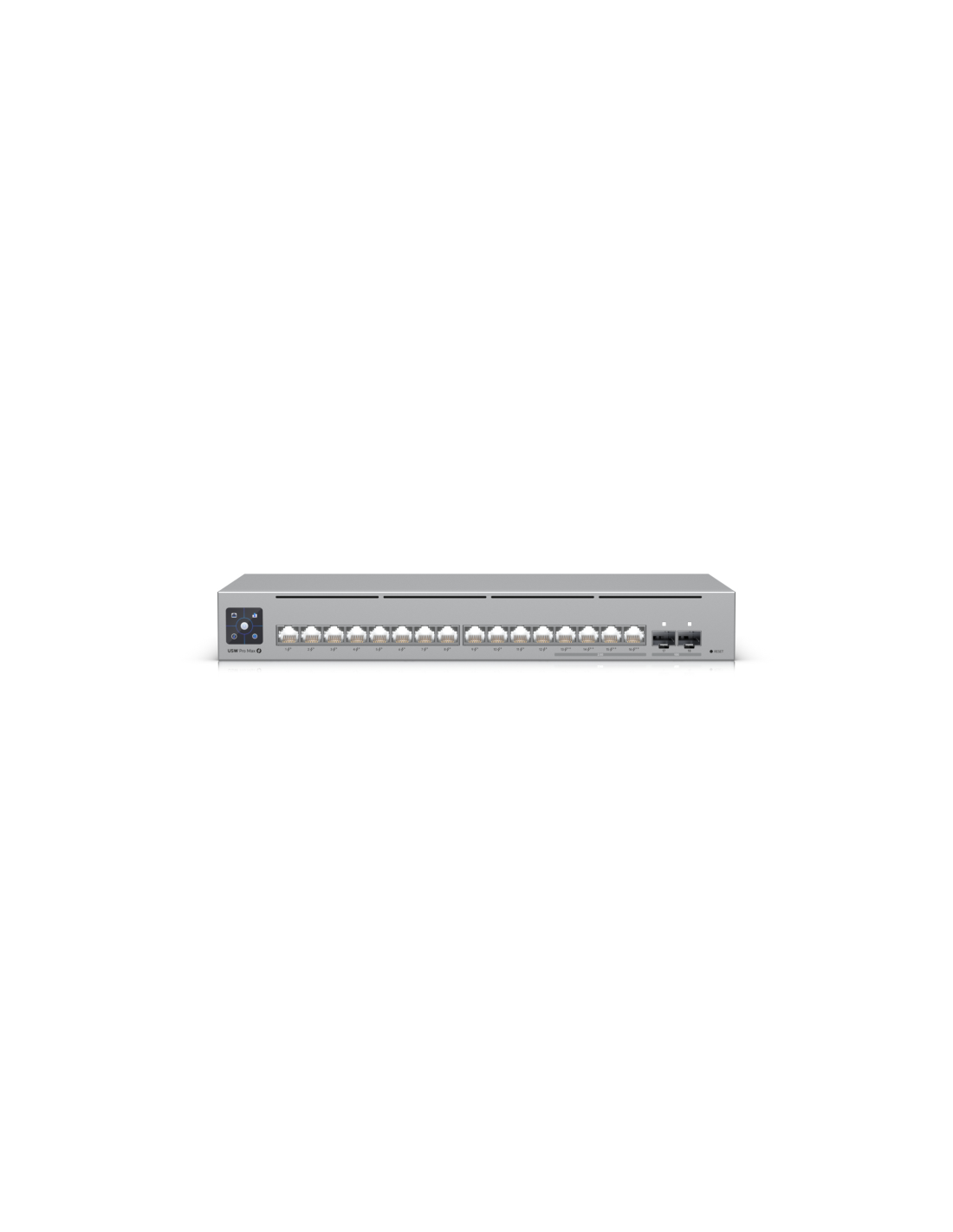 Ubiquiti Pro Max 16 PoE. Tipo de interruptor: Gestionado, Capa del interruptor: L3. Puertos tipo básico de conmutación RJ-45 Ethernet: Gigabit Ethernet (10/100/1000), Cantidad de puertos básicos de conmutación RJ-45 Ethernet: 16. Capacidad de conmutación: 84 Gbit/s. Estándares de red: IEEE 802.1x. Voltaje de entrada DC: 44 - 57 V. Conector eléctrico: Toma de entrada de CC. Energía sobre Ethernet (PoE). Montaje en rack