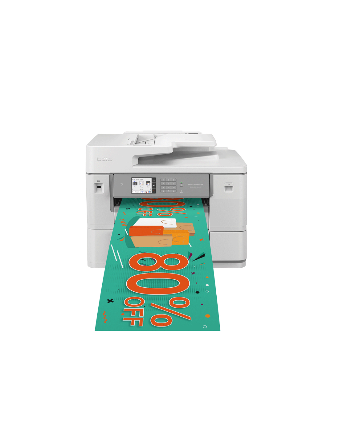 La impresora multifunción MFC-J6959DW ofrece impresión y escaneado hasta tamaño A3 de calidad superior, con la posibilidad de imprimir en rollo de papel. Imprime fácilmente pancartas, pósteres, fotos panorámicas y carteles promocionales con la longitud deseada gracias al cortador automático.Impresión de gran formato, copia A3, escáner A3 y fax A3Alimentador automático de documentos A3 de 50 hojasConexión a dispositivos móvilesPantalla táctil 8,8cmConexión a servicios en la nube (Web Connect)Memoria 512MBPCL6 y BR-Script3Cartuchos de 3.000 págs/negro y 1.500 págs/cada color incluidos en la impresora. Cartuchos XL disponibles que imprimen hasta 6000 páginas en negro y 5000 páginas en color (ISO 24711).