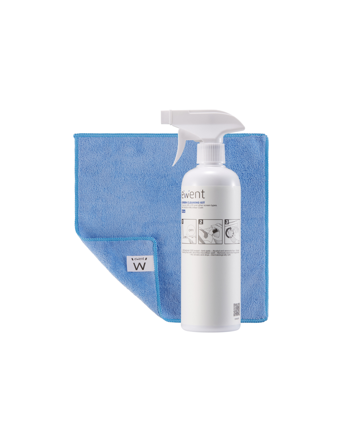 Ewent EW5678. Tipo de producto: Kit de limpieza para equipos, Uso adecuado: Pantallas / Plásticos, Universal, Volumen: 500 ml. Dimensiones del paño de limpieza: 300 x 300 mm. Cantidad por paquete: 1 pieza(s)