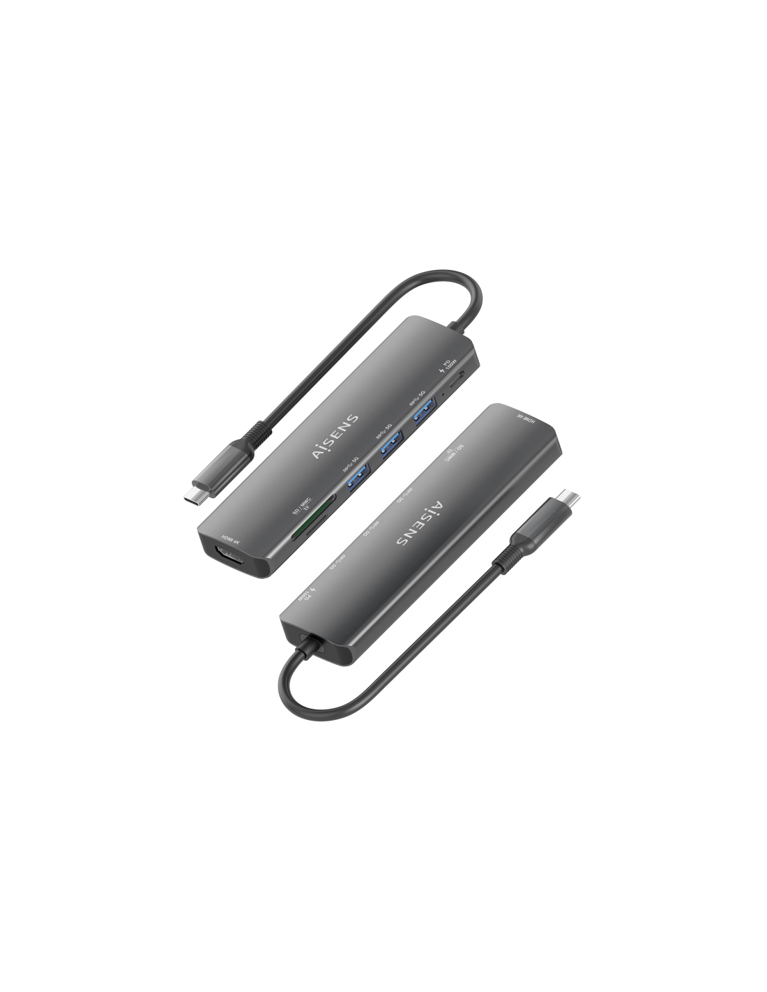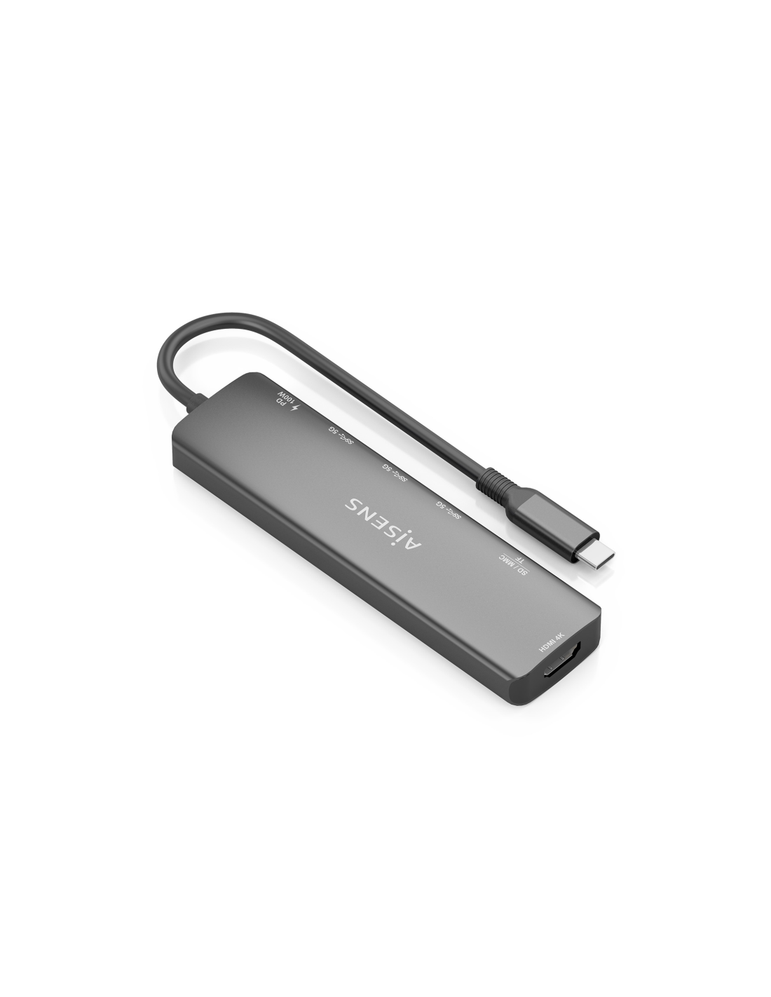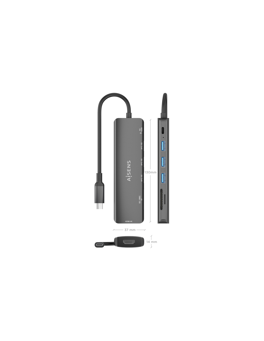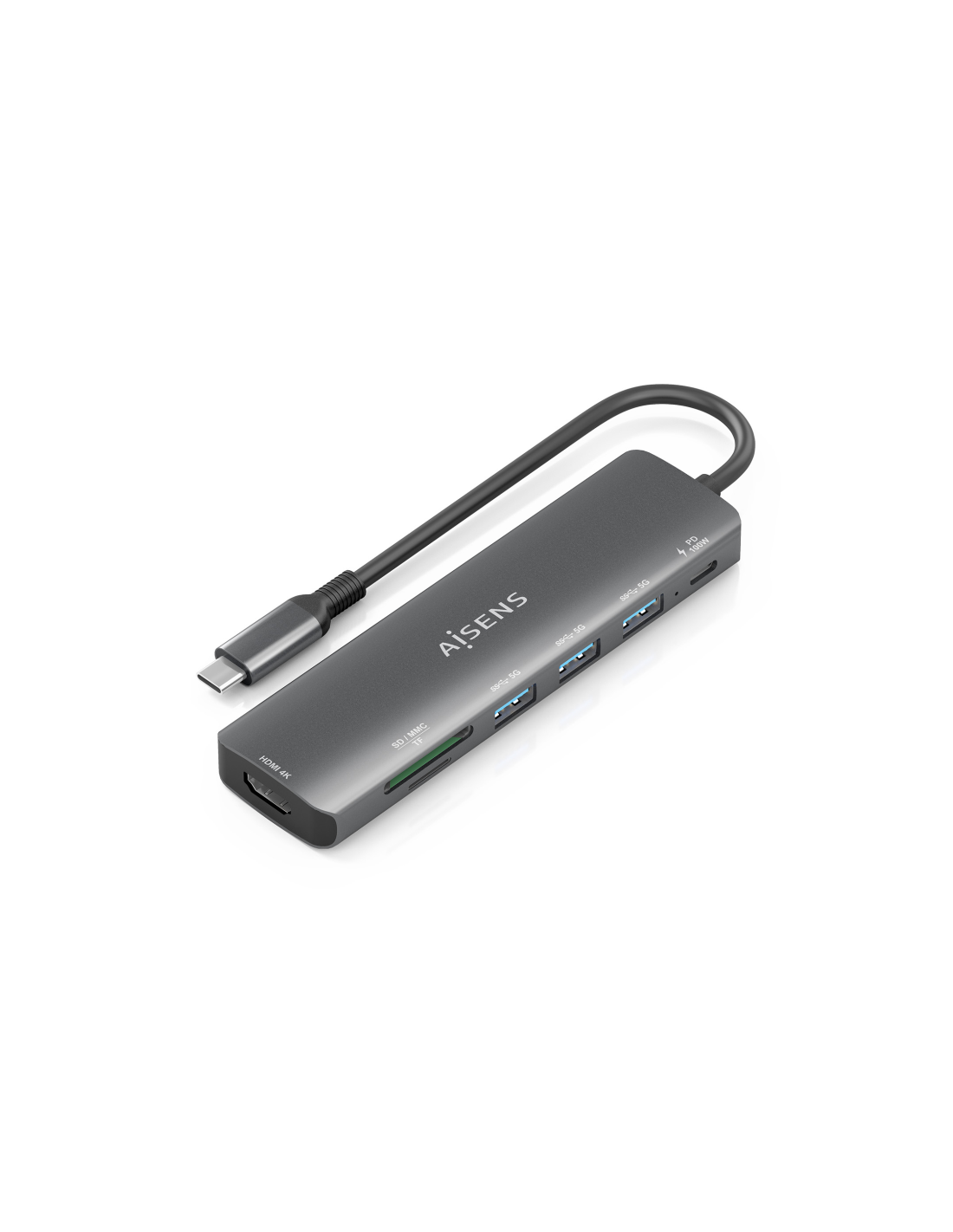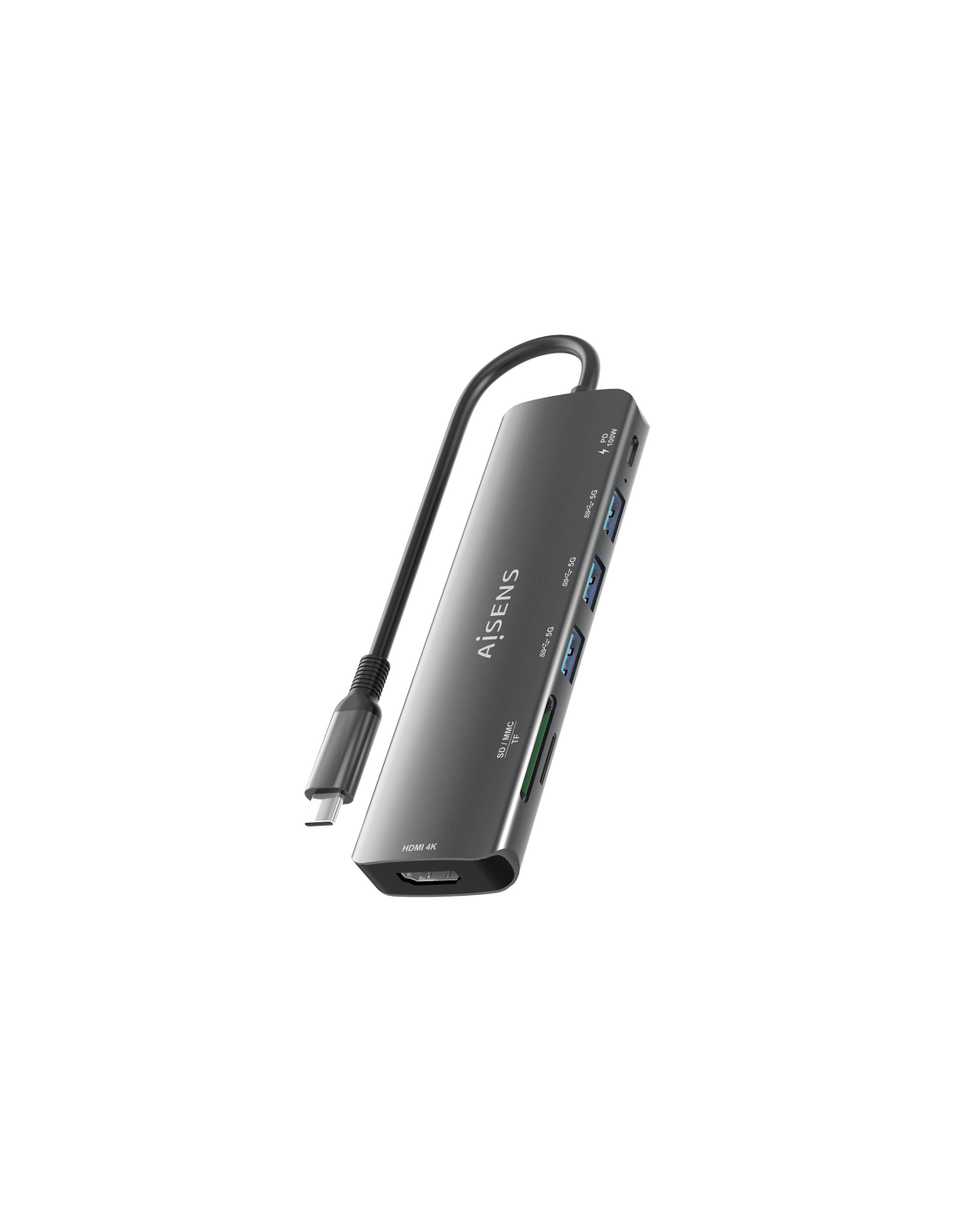 AISENS USB-C Dock 7 en 1, USB-C A, 1x HDMI, 3x USB-A, 1x USB-C PD 100W, 1x SD, 1x MicroSD, Gris, 15cm. Tecnología de conectividad: Alámbrico, Interfaz de host: USB 3.2 Gen 1 (3.1 Gen 1) Type-C, Entrega de energía USB (USB Power Delivery) de hasta: 100 W. Color del producto: Gris, Tarjetas de memoria compatibles: MMC, MicroSD (TransFlash), MicroSDHC, MicroSDXC, RS-MMC, SD, SDHC, SDXC, Velocidad de transferencia de datos: 5 Gbit/s. Alimentación: USB, Conector eléctrico: USB Tipo C, Longitud del cable USB: 0,1
