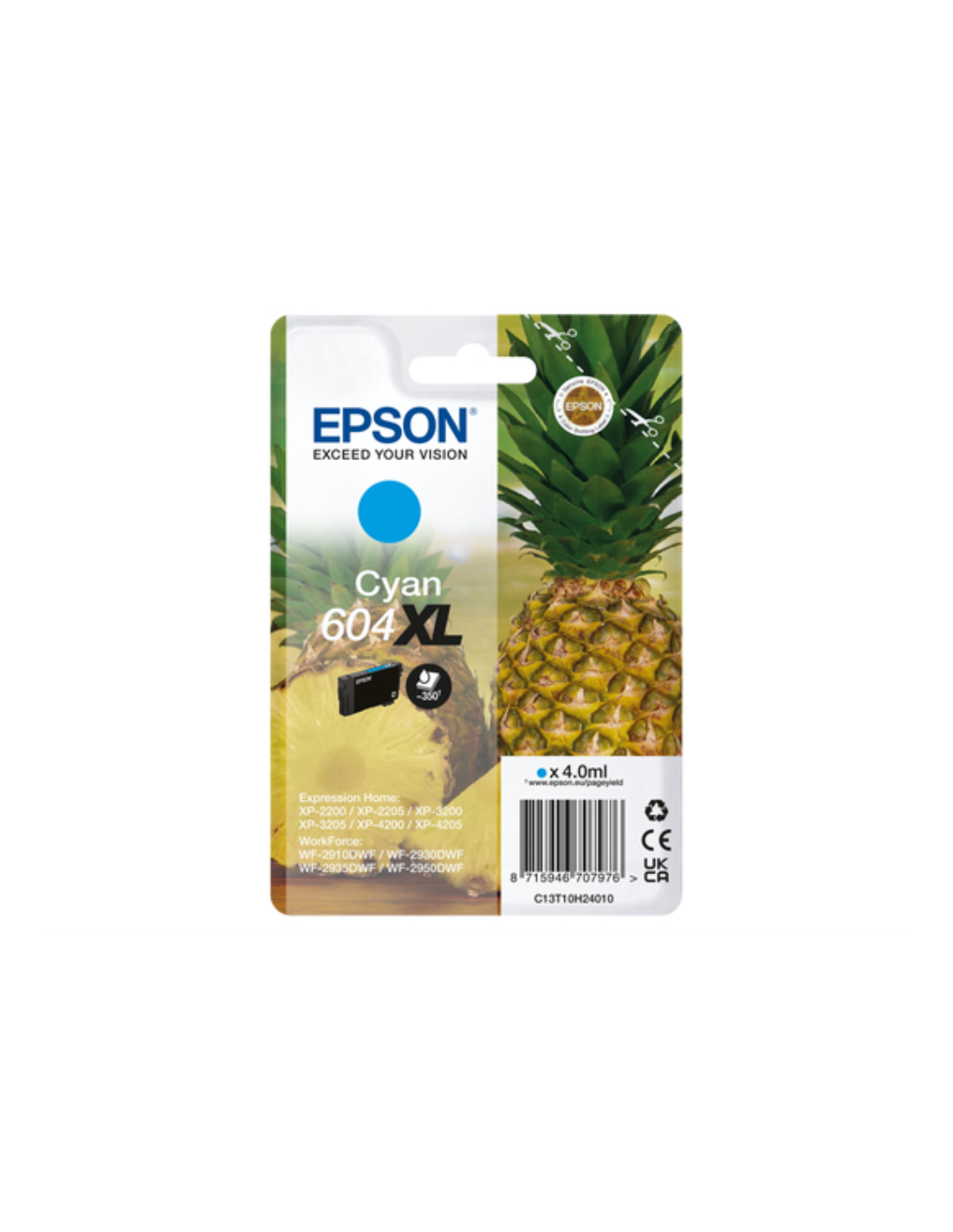 Epson 604XL. Tipo de cartucho de tinta: Alto rendimiento (XL), Tipo de suministro: Pack individual, Rendimiento de impresión de página con tinta de color: 350 páginas, Volumen de tinta de color: 4 ml, Colores de impresión: Cian, Cantidad por paquete: 1 pieza(s)