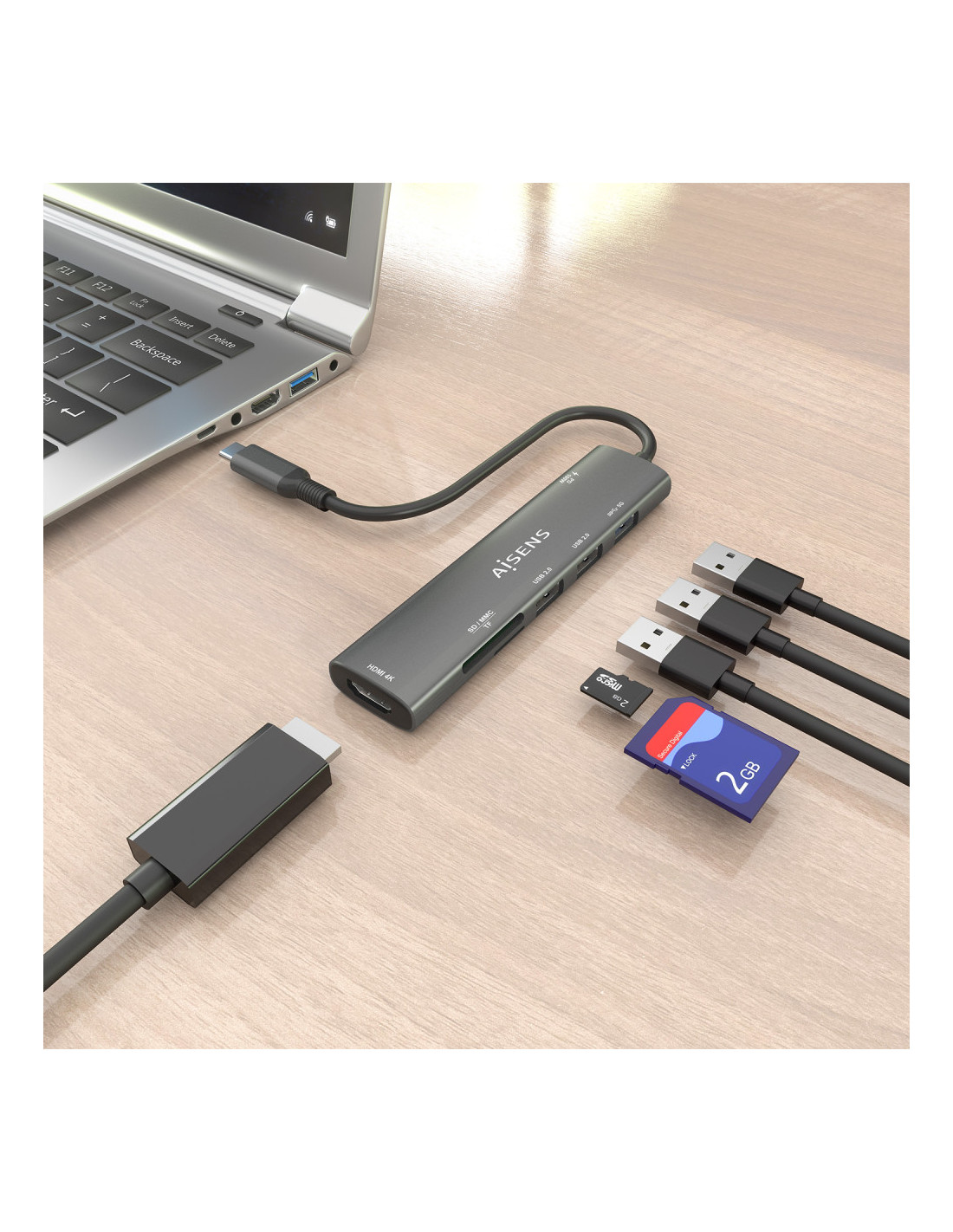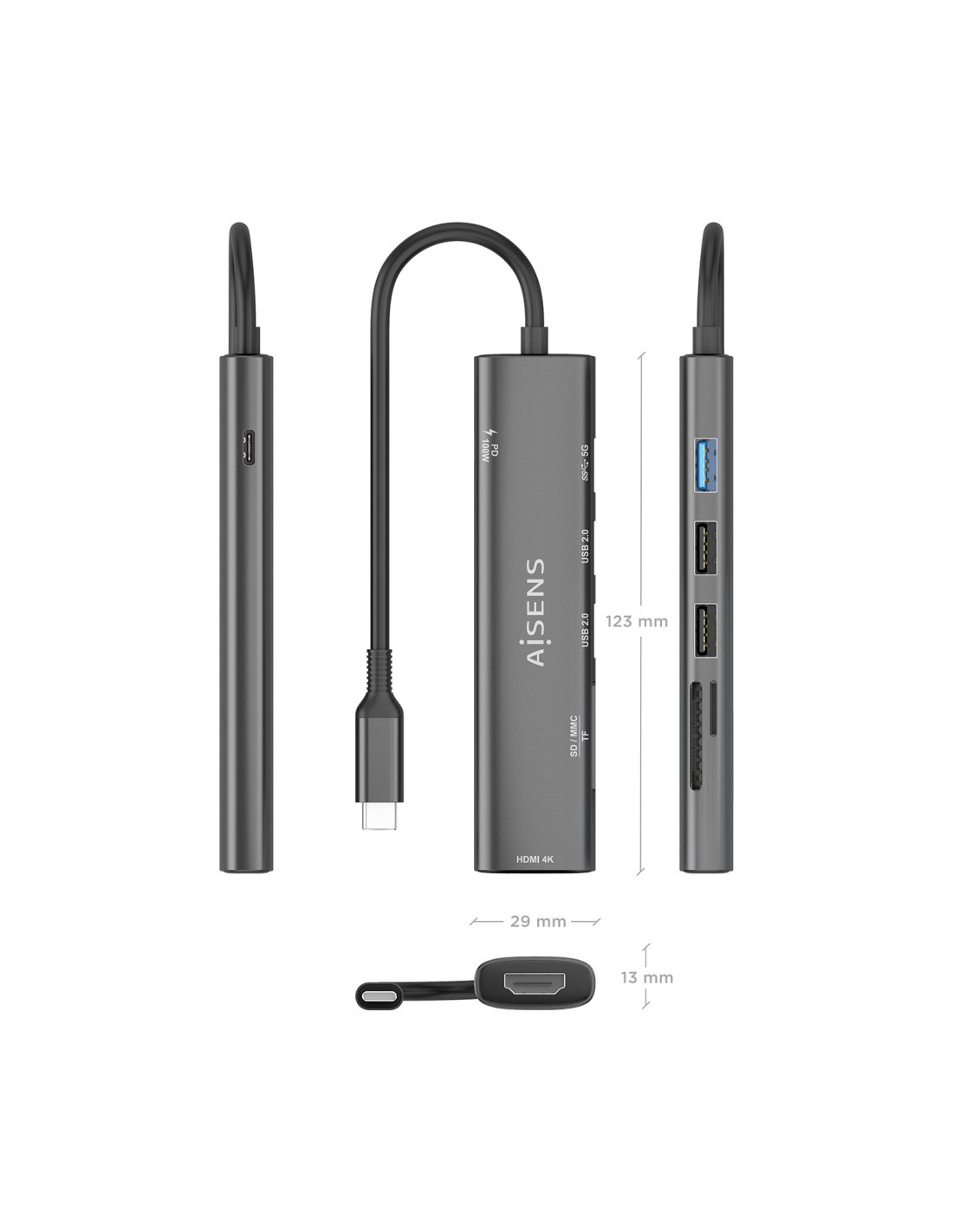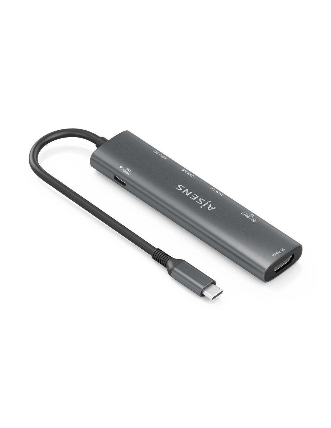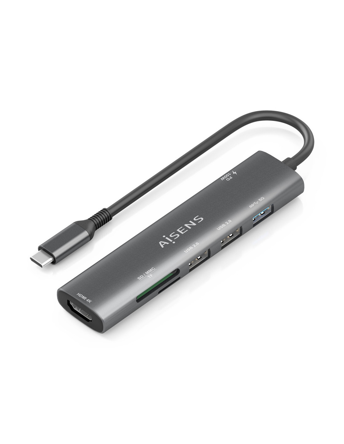 > Conversor USB-C a 1xHDMI, 2xUSB-A USB2.0, 1xUSB-A USB3.0, 1xUSB-C PD 100W, 1xLector de tarjeta SD, 1xLector de tarjeta MICRO SD