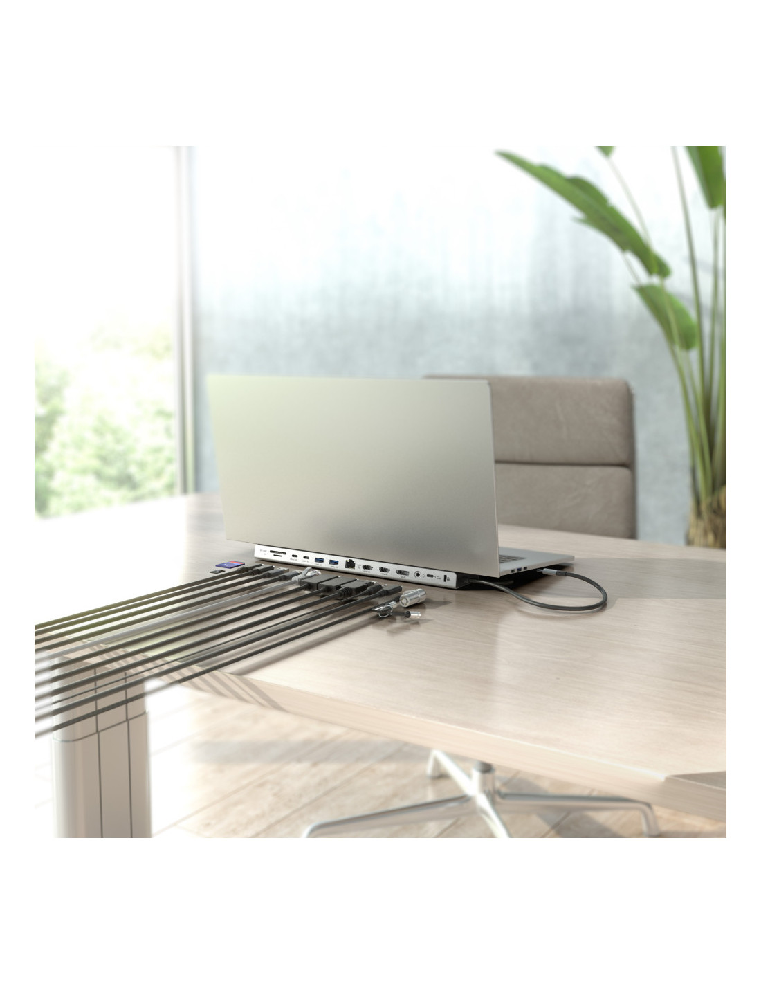 > Este dock USB-C incorpora una ranura de seguridad Kensington de 7×3 mm (K slot), lo que permite conectar un candado compatible para fijar el dispositivo y prevenir robos. Ideal para entornos de oficina, espacios compartidos o estaciones de trabajo públicas.