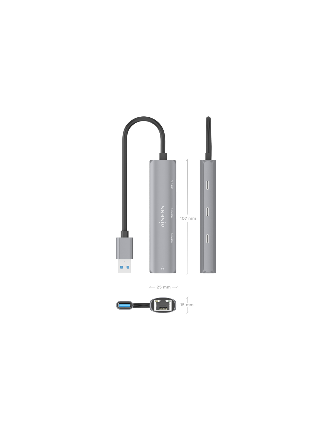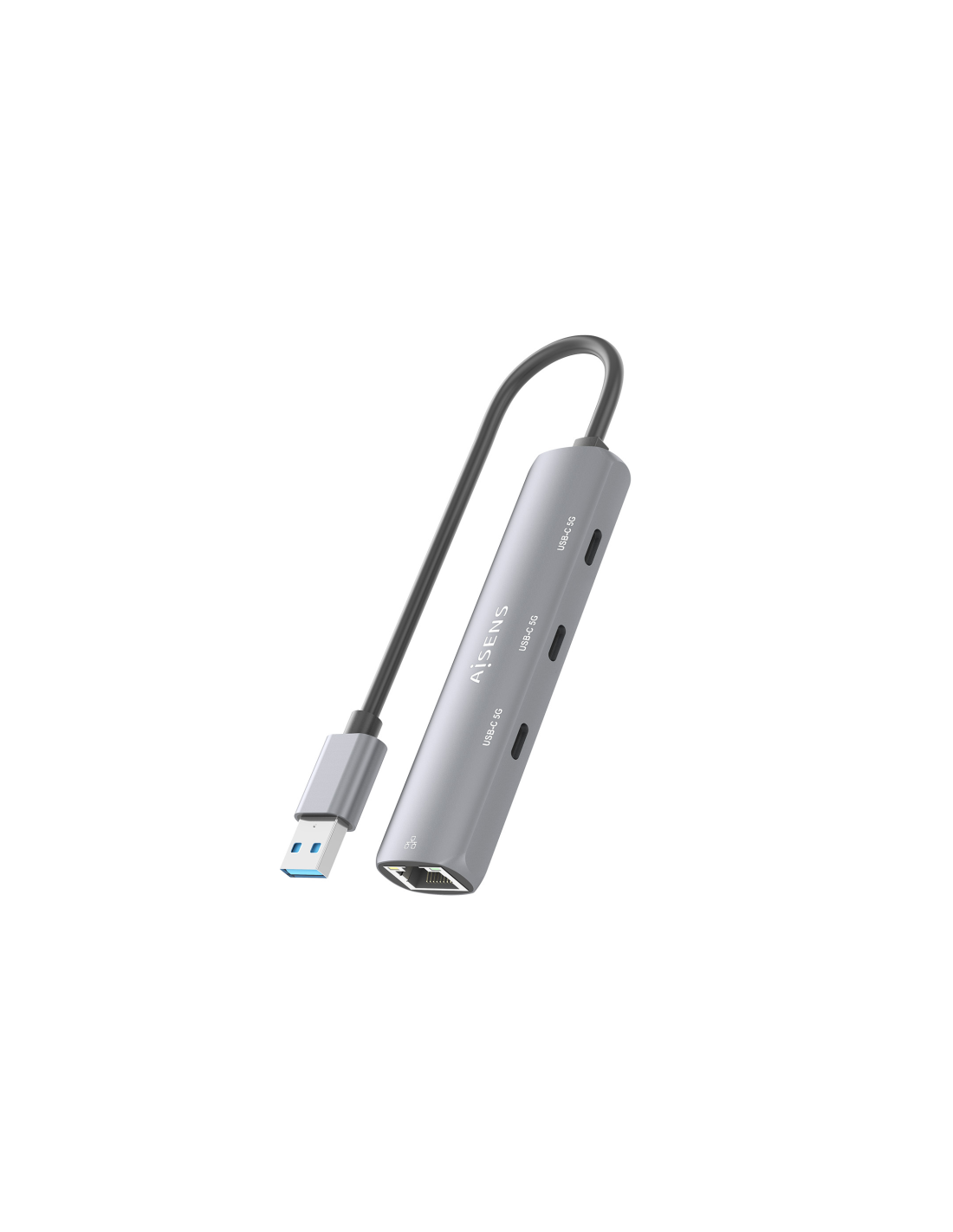 AISENS USB3.0 Dock USB-A A Ethernet Gigabit + Hub 3xUSB-C, Gris, 15cm. Tecnología de conectividad: Alámbrico, Interfaz de host: USB 3.2 Gen 1 (3.1 Gen 1) Type-A. Ethernet LAN, velocidad de transferencia de datos: 10,100,1000 Mbit/s, Estándares de red: IEEE 802.3, IEEE 802.3ab, IEEE 802.3u. Color del producto: Gris. Alimentación: USB, Conector eléctrico: USB tipo A, Longitud del cable USB: 0,15 m. Sistema operativo Windows soportado: Windows 10, Windows 11