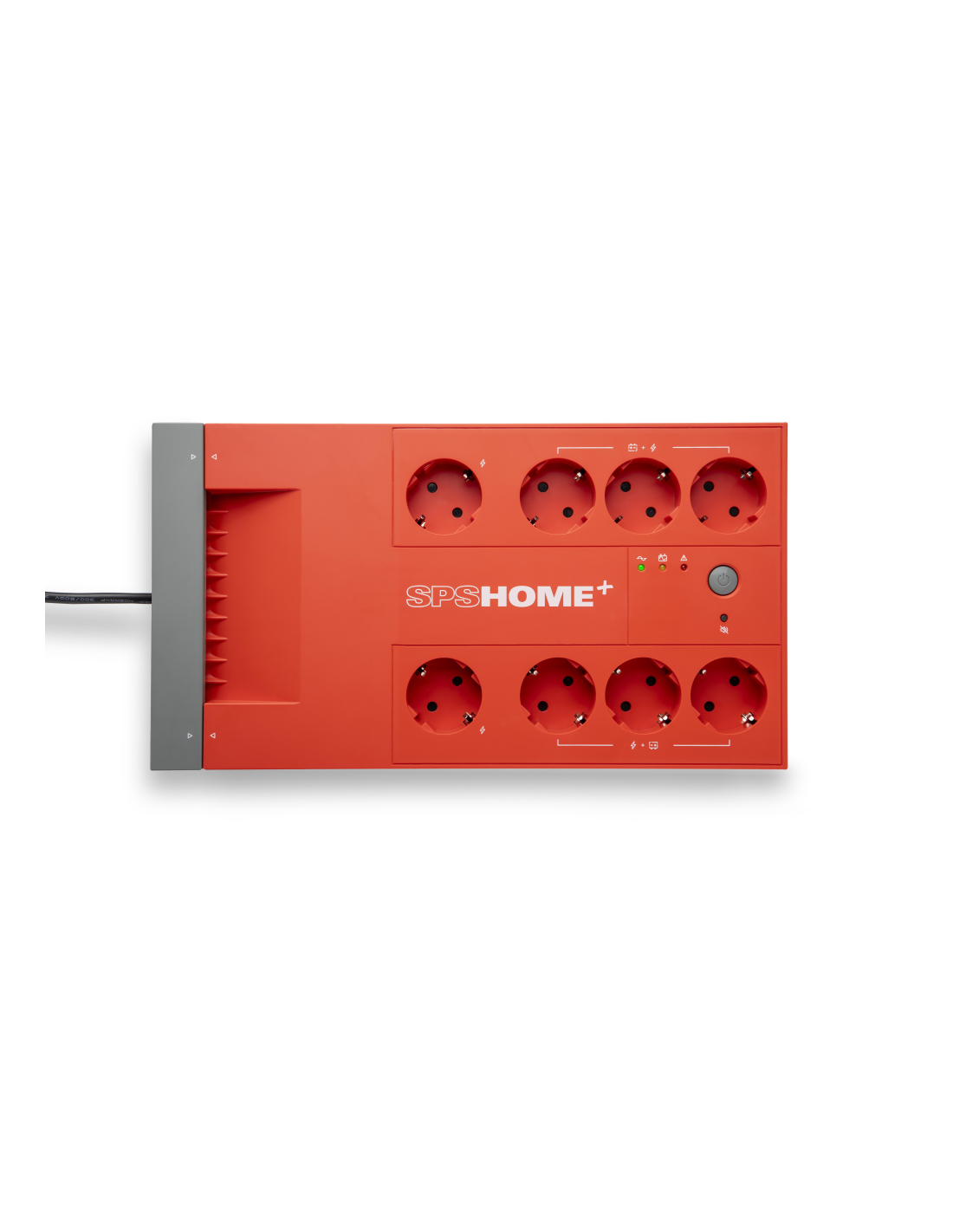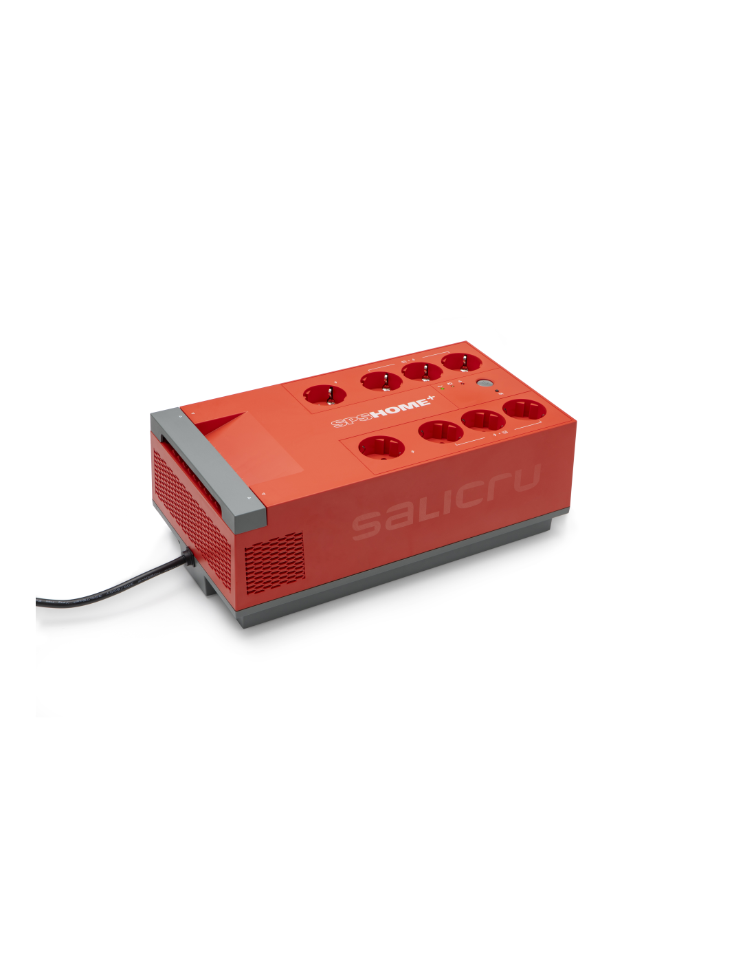 Salicru SPS 650 HOME+. Topología UPS: Línea interactiva, Capacidad de potencia de salida (VA): 0,65 kVA, Potencia de salida: 360 W. Tipo de salida AC: Tipo F, Conector: Tipo F, Cantidad de salidas AC: 8 salidas AC. Tecnología de batería: Plomo-Calcio (Pb-Ca), Tiempo de recarga (90%): 8 h. Factor de forma: Compacto, Color del producto: Rojo, Tipo de control: Botones. Certificación: EN-IEC 62040-1 EN 62040-2 EN 62040-3 ISO 9001, ISO 14001, ISO 45001