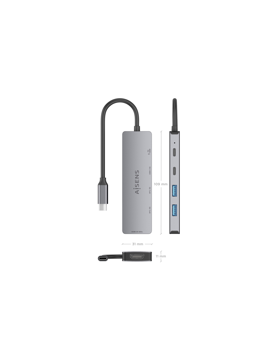 AISENS USB-C Dock 5 en 1, USB-C a 1xHDMI 2xUSB-A 1xUSB-C 1xUSB-C PD, Gris, 15cm. Tecnología de conectividad: Alámbrico, Interfaz de host: USB 3.2 Gen 1 (3.1 Gen 1) Type-C, Entrega de energía USB (USB Power Delivery) de hasta: 100 W. Color del producto: Gris, Velocidad de transferencia de datos: 5 Gbit/s, Tipo HD: 4K Ultra HD. Alimentación: USB, Conector eléctrico: USB Tipo C, Longitud del cable USB: 0,15 m. Ancho: 31 mm, Profundidad: 109 mm, Altura: 11 mm. Cantidad por paquete: 1 pieza(s), Ancho del paquete