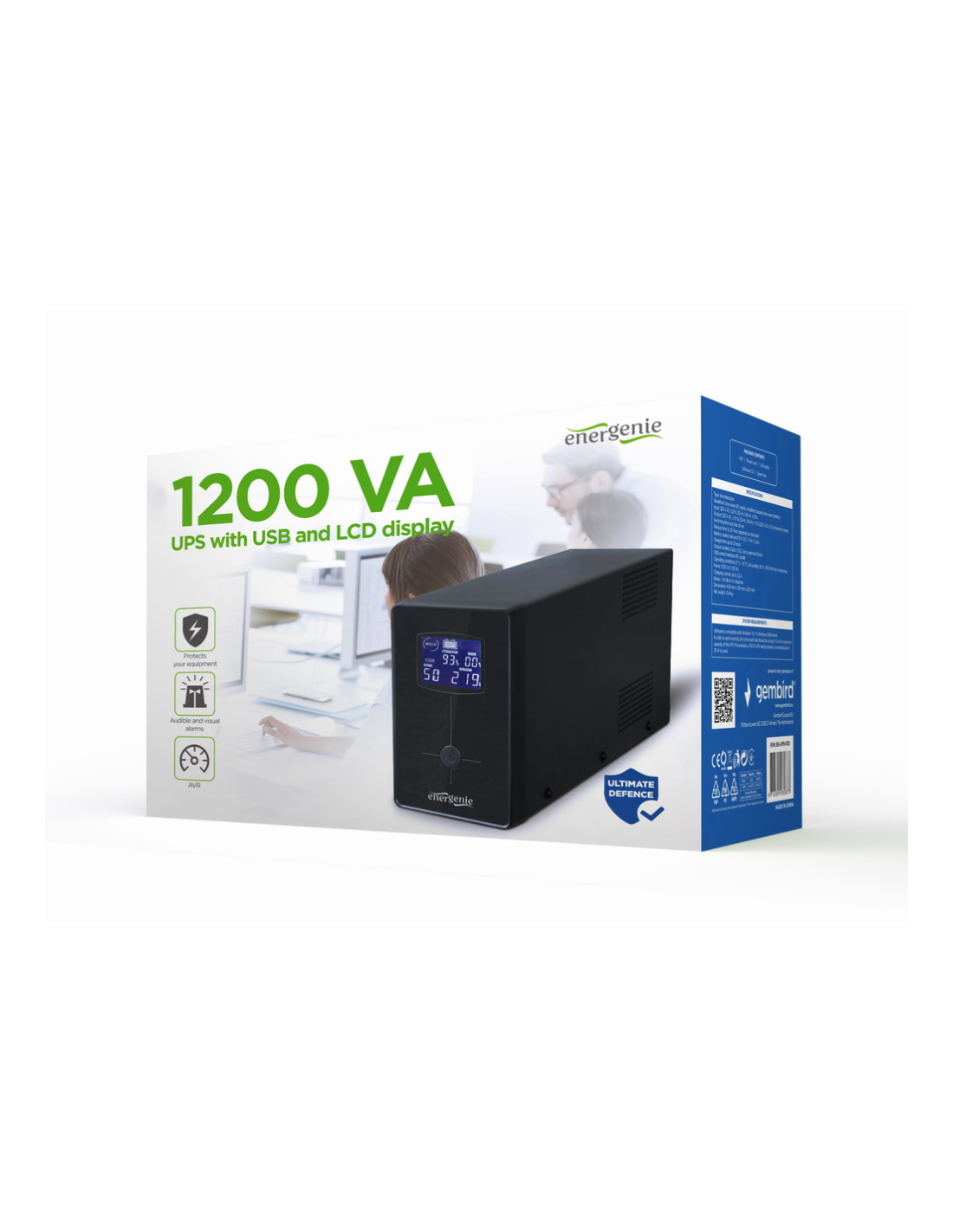 Gembird EG-UPS-033. Topología UPS: Línea interactiva, Capacidad de potencia de salida (VA): 1,2 kVA, Potencia de salida: 720 W. Tipo de salida AC: C13 acoplador, Cantidad de salidas AC: 3 salidas AC. Tecnología de batería: Sealed Lead Acid (VRLA), Capacidad de la batería: 7 Ah, Voltaje de la pila: 12 V. Factor de forma: Torre, Color del producto: Negro, Tipo de visualizador: LCD. Cables incluidos: Cable USB