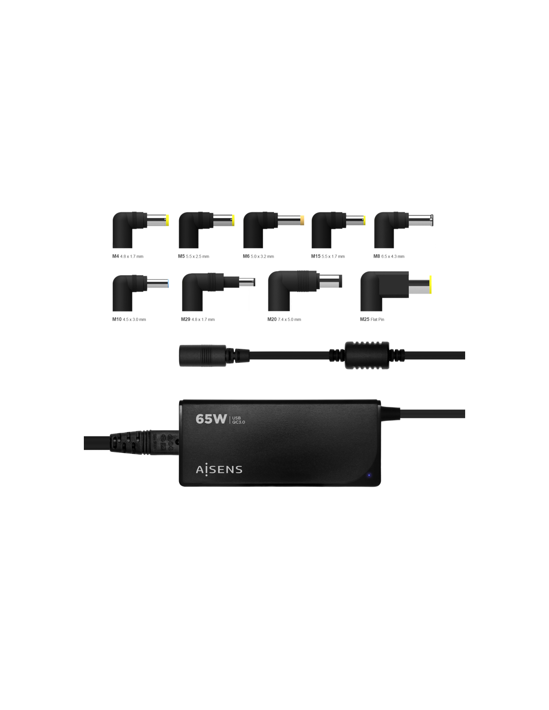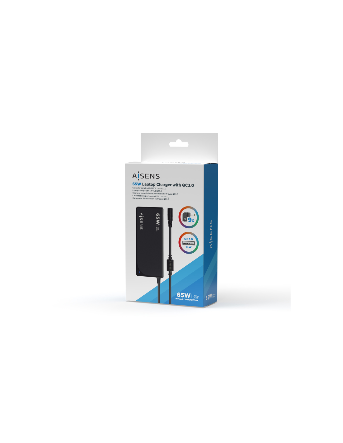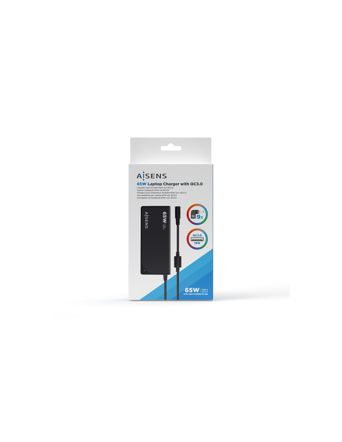 AISENS Cargador 65 W Automatico Universal Multitension Para Portatil Con 9 Conectores + USB-A QC.3.0