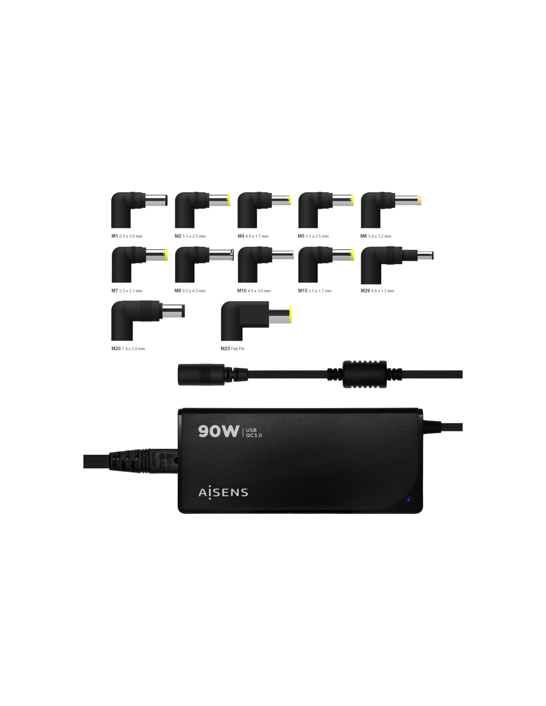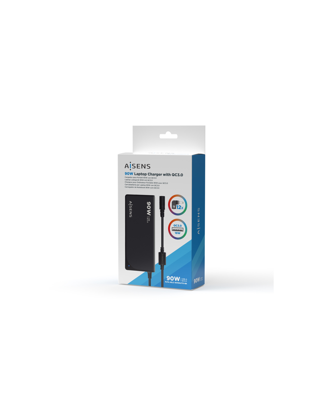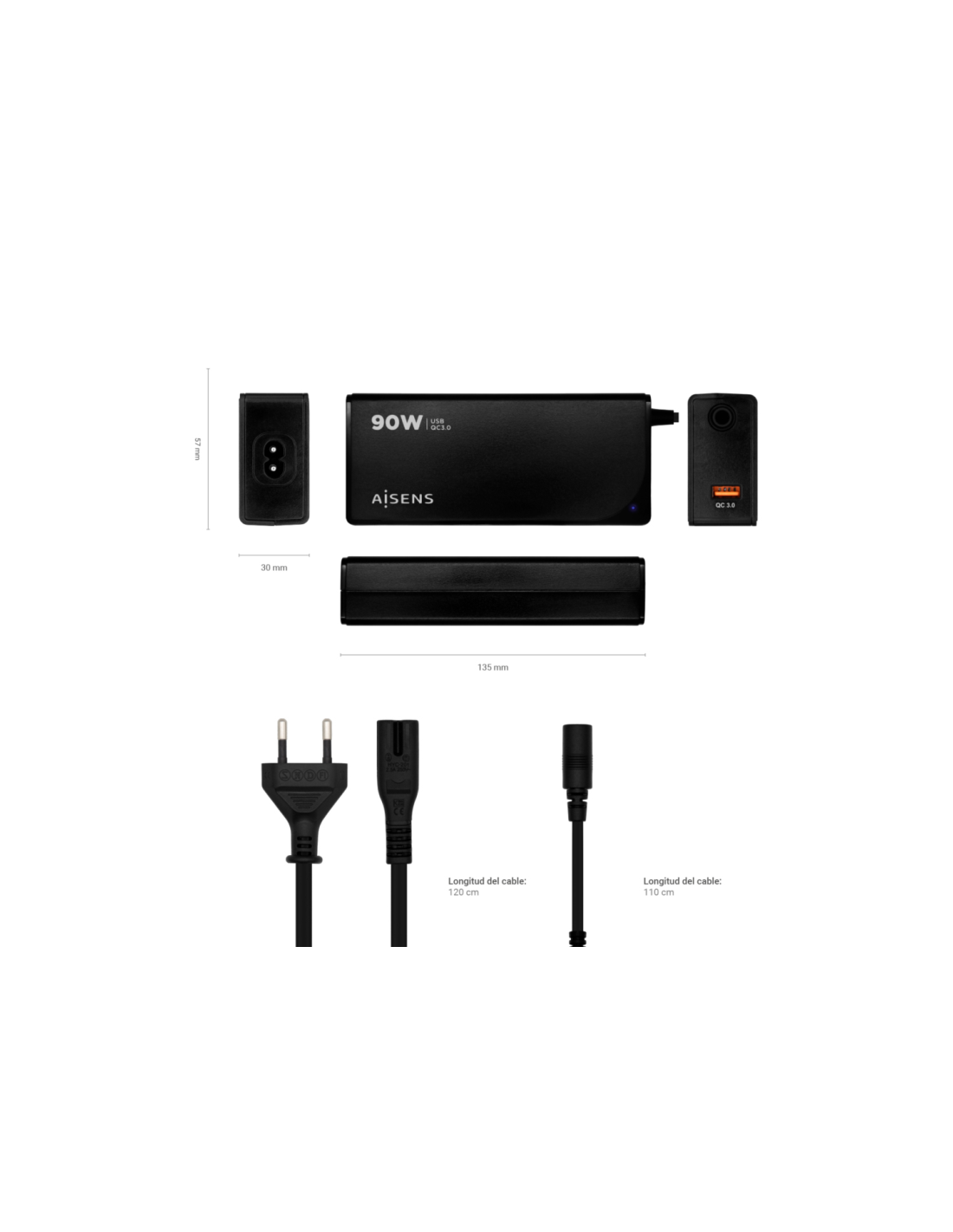 AISENS ASLC-90WAUTO-BK. Utilizar con: Universal, Tipo de fuente de alimentación: Interior, Voltaje de entrada: 100 - 240 V. Color del producto: Negro. Certificados de conformidad: CE, RoHS. Longitud de cable: 1,2 m, Ancho: 57 mm, Profundidad: 135 mm. Ancho del paquete: 138 mm, Profundidad del paquete: 55 mm, Altura del paquete: 225 mm