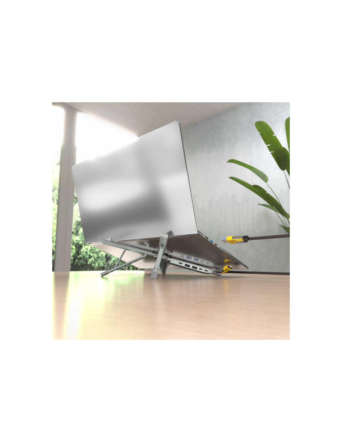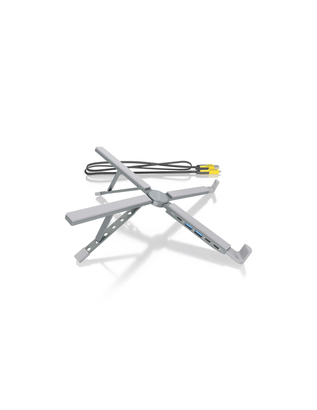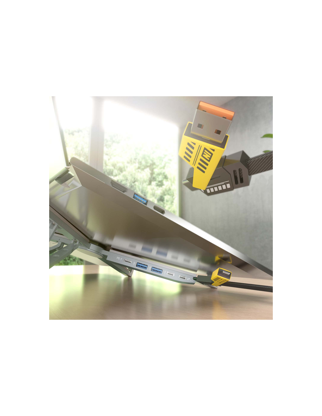 - Este soporte para portátil incluye un docking USB-C 4 en 1, con 2 puertos USB-A 2.0, 1 puerto USB-C 2.0 y 1 puerto USB-C PD de 100W para carga rápida del portátil. Facilita la conexión de dispositivos como teclados, ratones y pendrives, mientras mejora la refrigeración al elevar el portátil.