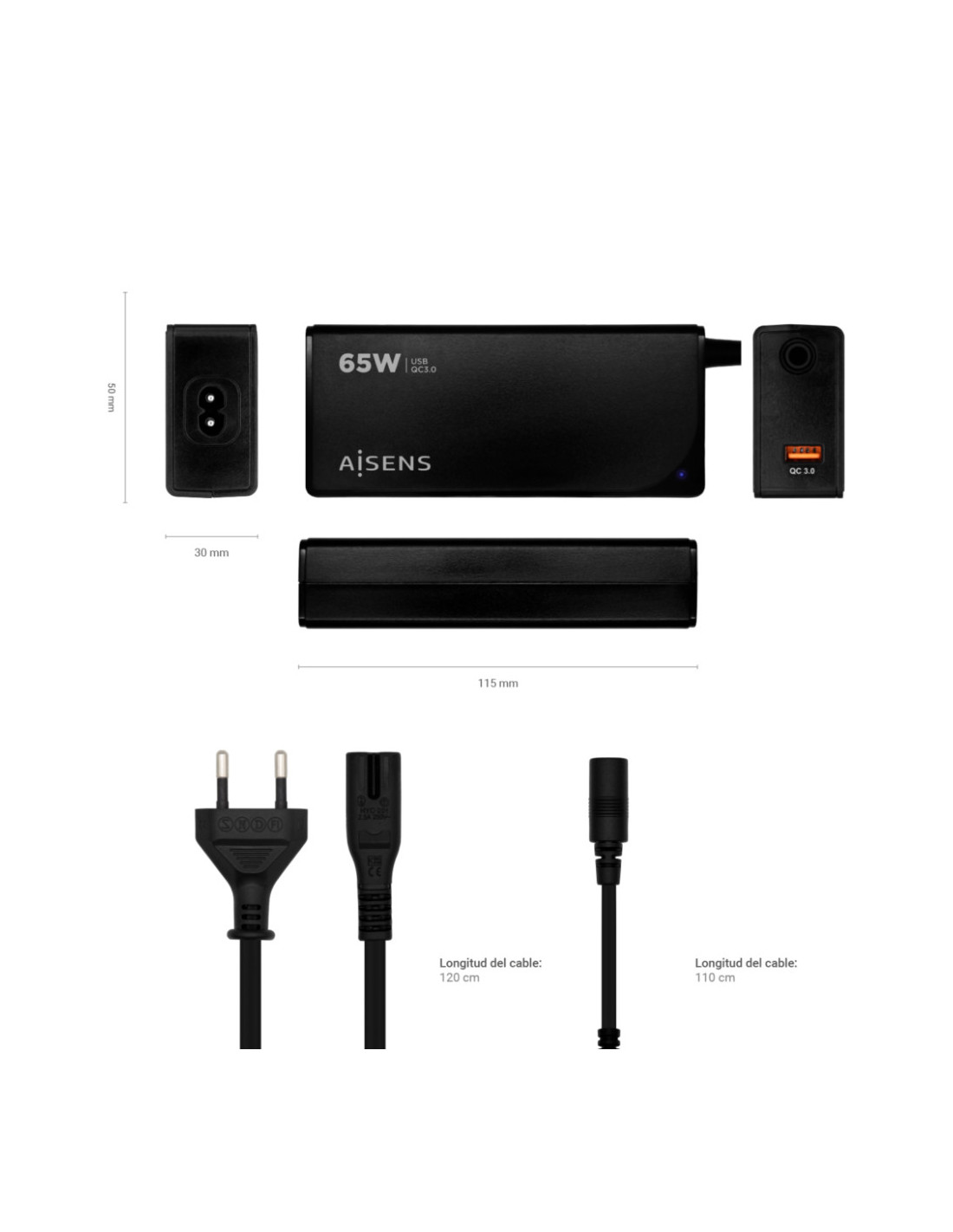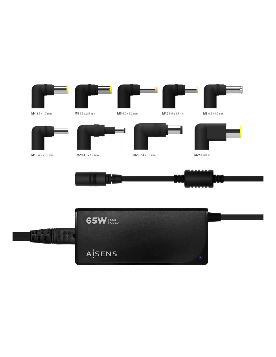 Cargador 65W automático universal con 9 conectores y USB QC3.0 para cargar portátiles, móviles, cámaras y tablets etc. Diseño muy elegante, moderno y práctico.