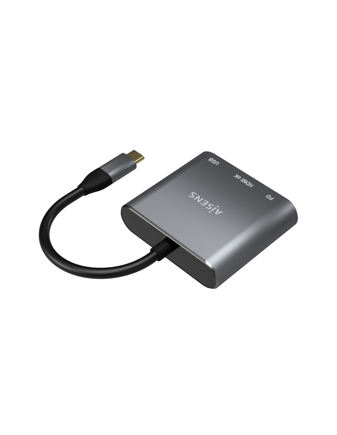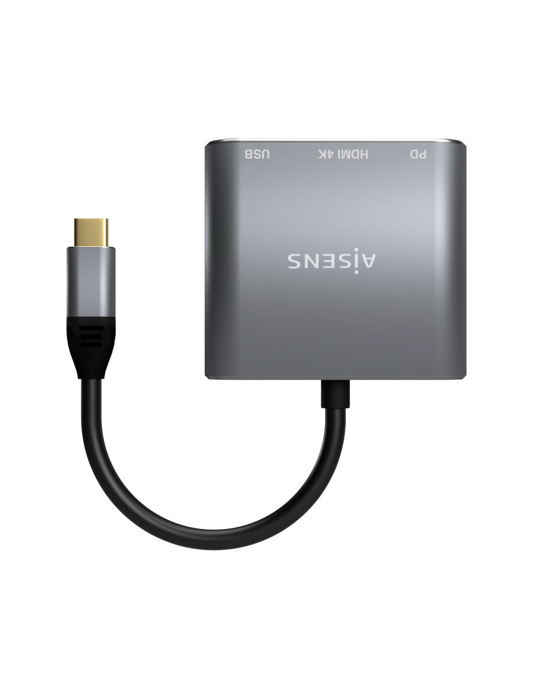 AISENS® – Conversor USB-C a HDMI/USB-C/tipo A USB 3.0, 3 en 1, con conector USB Tipo-C macho en un extremo y HDMI 4K@30Hz hembra, USB 3.0 hembra y USB-C hembra en el otro.