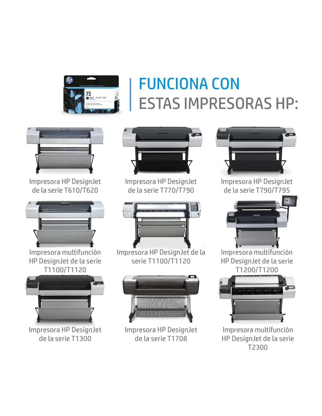 - Impresora HP DesignJet serie T610, impresora serie T620, impresora serie T770, impresora serie T1100, impresora serie T1200; Impresora multifuncional HP DesignJet T1200 HD; Impresora multifuncional HP DesignJet T2300 con conexión web; ePrinter HP DesignJe