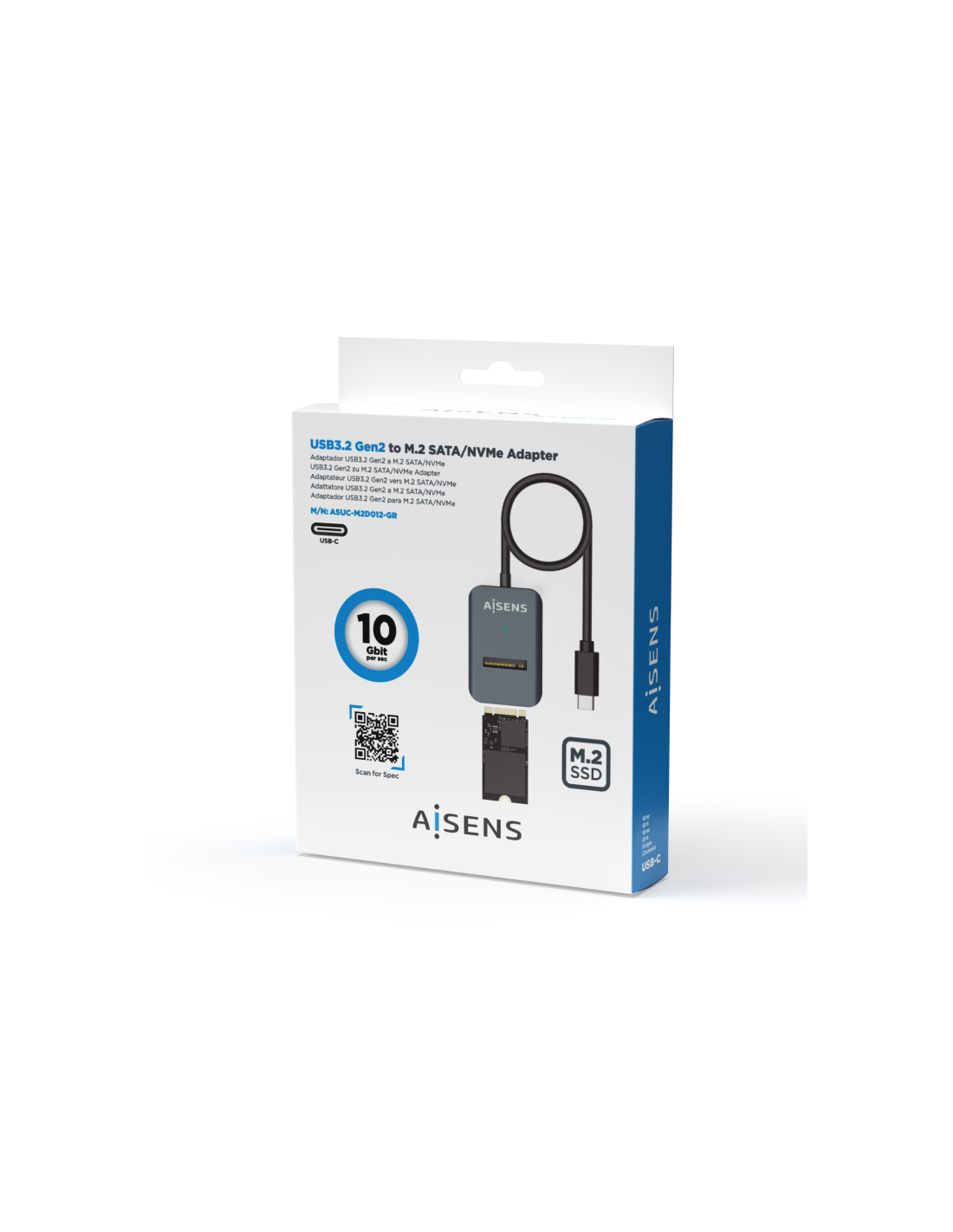 AISENS USB-C Dock M.2 (NGFF) ASUC-M2D012-GR SATA/NVMe A USB3.1 Gen2, Gris. Tipo de producto: Caja externa para unidad de estado sólido (SSD). Número de unidades de almacenamiento compatibles: 1, Tamaño de la unidad de almacenamiento: M.2, Interfaces de disco de almacenamiento soportados: SATA, Capacidad máxima de almacenaje: 2 TB. Velocidad de transferencia de datos: 10 Gbit/s. Color del producto: Gris. Conector USB: USB Tipo C