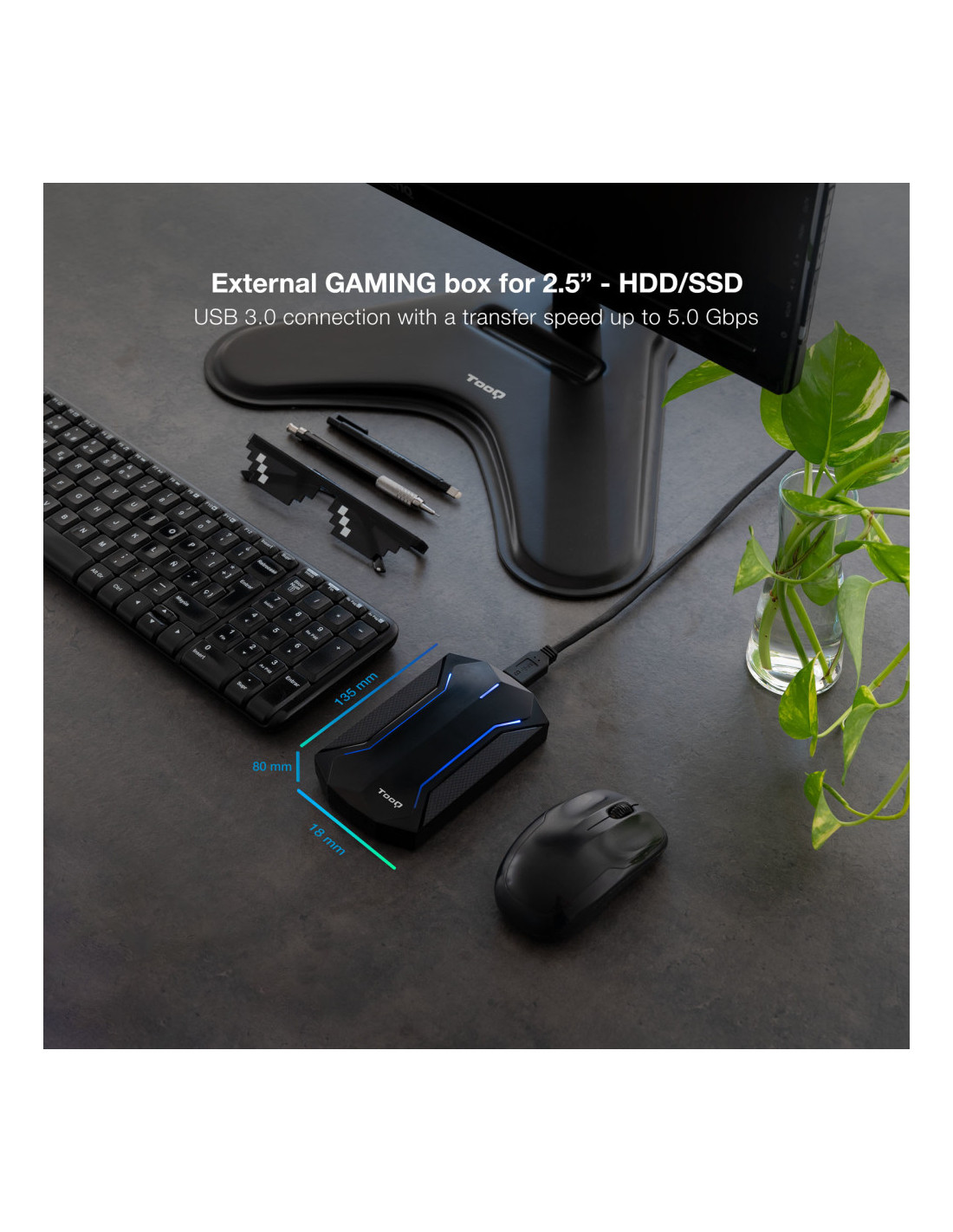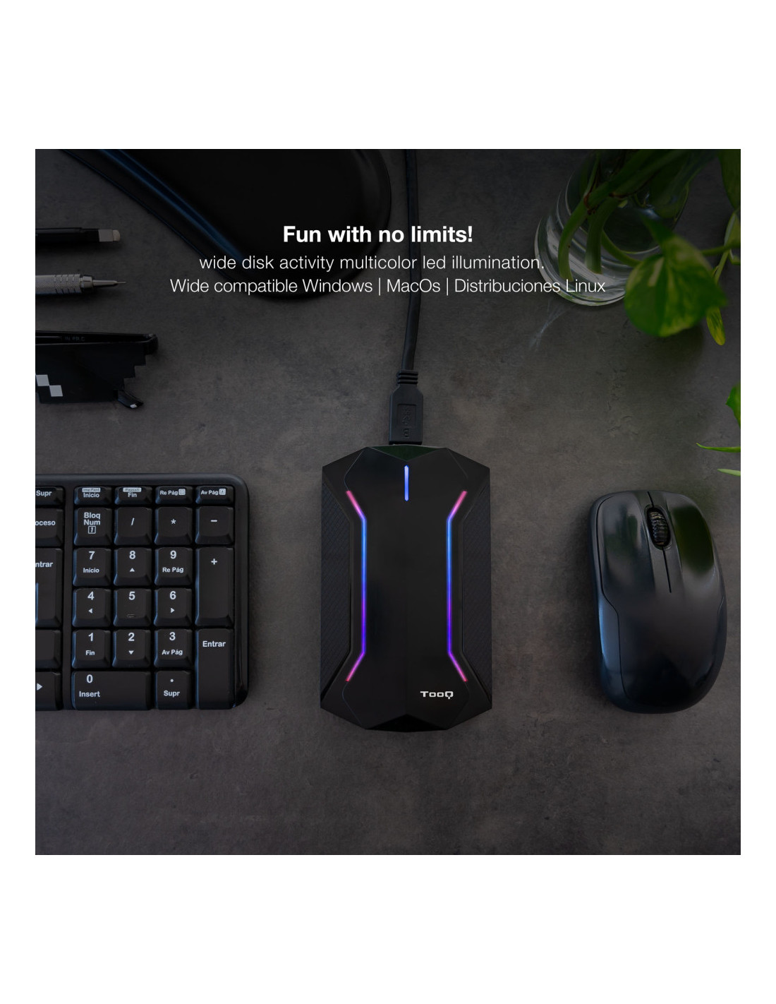Todos tus juegos, partidas, y cualquier dato que guardes, lucirán espectaculares en nuestra caja externa gaming para discos de 2.5” HDD/SSD. ¡Podrás llevar todo lo que quieras a donde desees al más puro estilo cyberpunk!