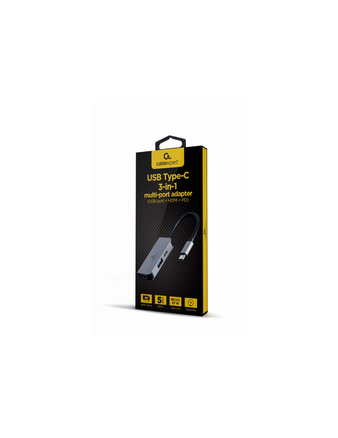 Gembird A-CM-COMBO3-02. Tecnología de conectividad: Alámbrico, Interfaz de host: USB 3.2 Gen 1 (3.1 Gen 1) Type-C, Entrega de energía USB (USB Power Delivery) de hasta: 87 W. Color del producto: Plata, Velocidad de transferencia de datos: 5 Gbit/s, Resolución (máxima digital): 3840 x 2160 Pixeles. Voltaje de salida: 5 - 20 V, Longitud del cable USB: 0,12 m. Ancho: 62 mm, Profundidad: 28 mm, Altura: 10 mm. Ancho del paquete: 20 mm, Profundidad del paquete: 75 mm, Altura del paquete: 175 mm