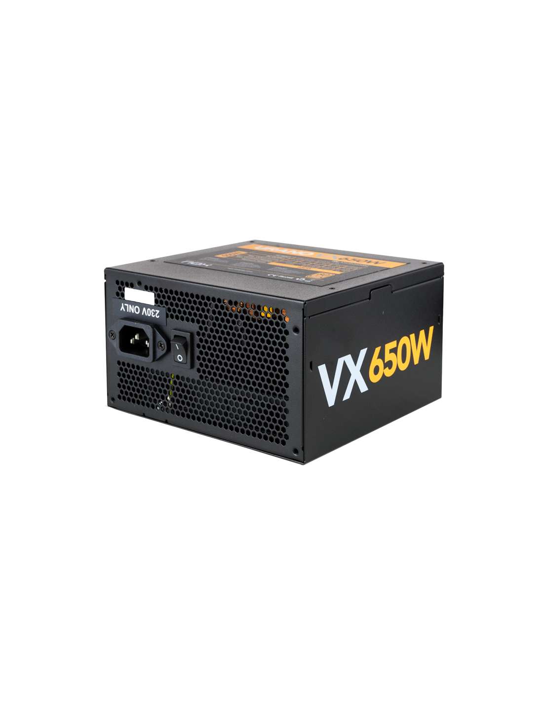 NOX Urano VX Bronze Edition. Potencia total: 650 W, Voltaje de entrada AC: 200 - 240 V, Frecuencia de entrada AC: 47 - 63 Hz. Alimentador de energía para tarjeta madre: 20+4 pin ATX, Longitud del cable de alimentación SATA: 600,750,900 mm, Longitud del cable de alimentación periférico (Molex): 600,750 mm. Utilizar con: PC, Factor de forma de fuente de alimentación (PSU): ATX, Certificación 80 PLUS: 80 PLUS Bronze. Color del producto: Negro, Naranja, Tipo de enfriamiento: Activo, Diámetro de ventilador: 12 cm. Certificados de conformidad: RoHS, Certificación: CE, WEEE, ERP 2013