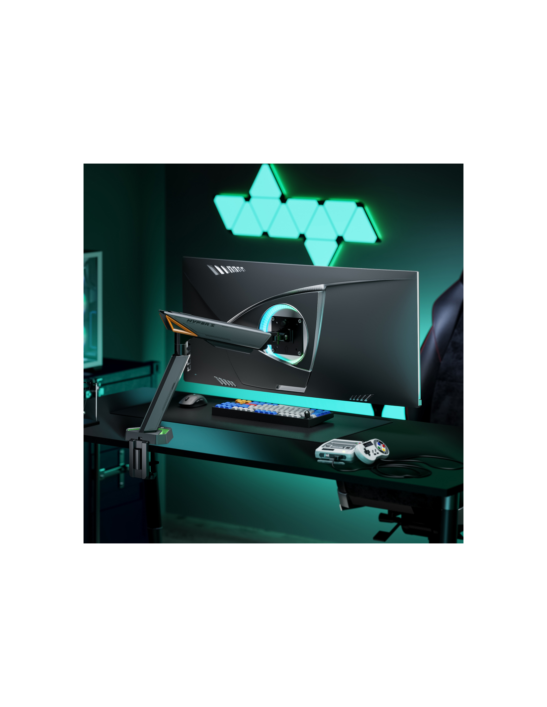 - Soporte de mesa RGB gaming contrapeso giratorio e inclinable para monitor/TV (3 pivotes, 1 brazo) de 17”-49”