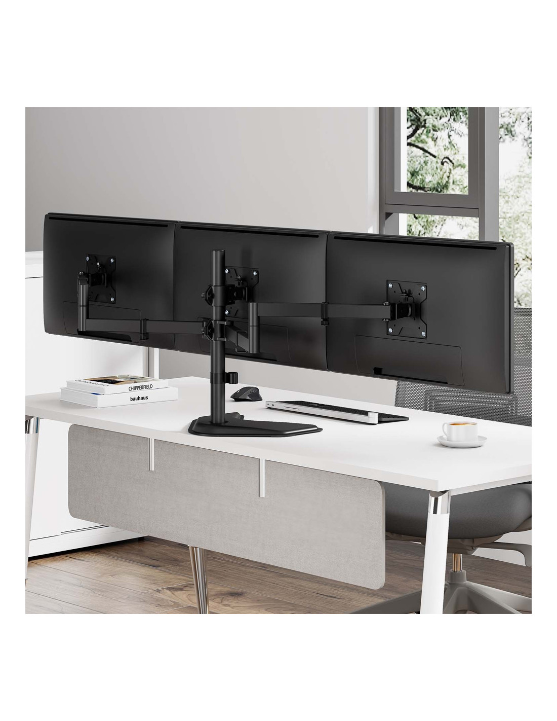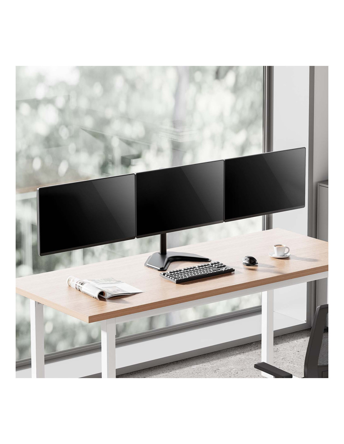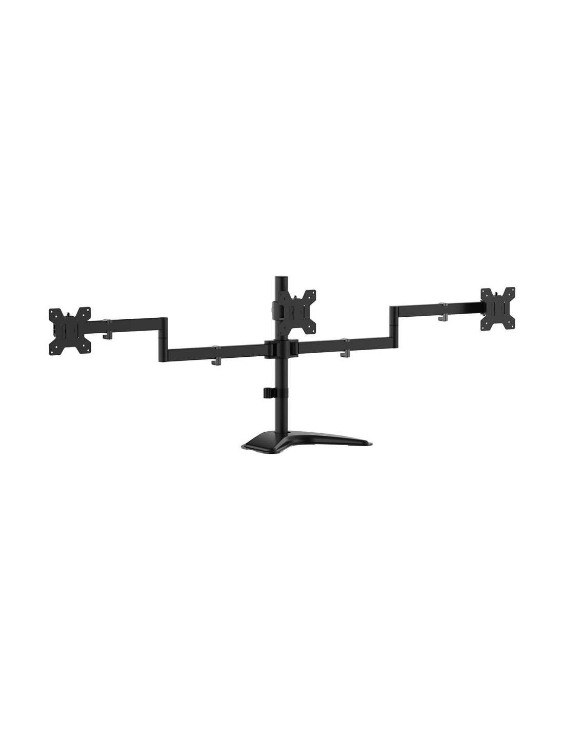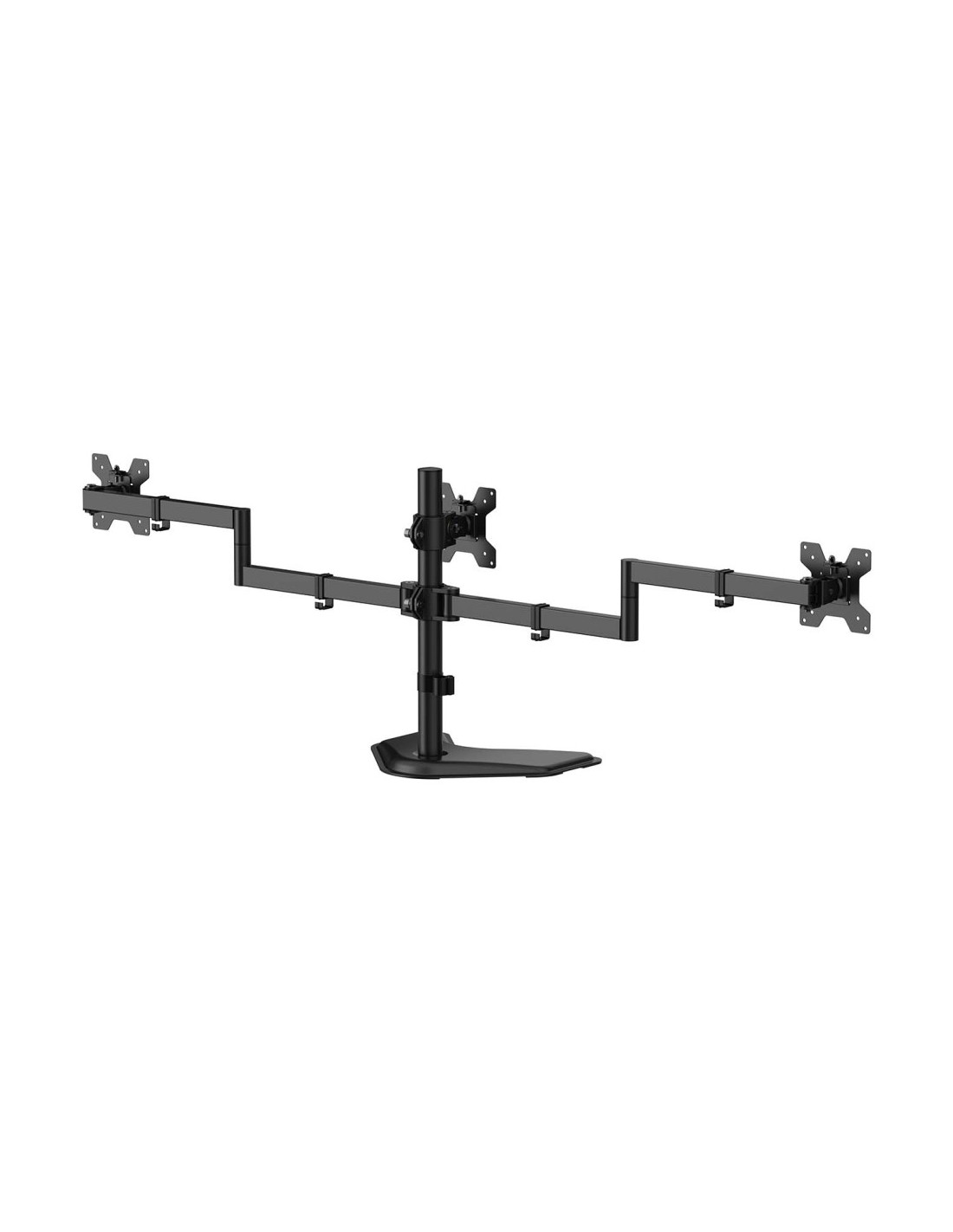 Soporte de mesa con peana eco giratorio e inclinable para 3 monitores (3 pivotes, 2 brazos) de 13”-27”