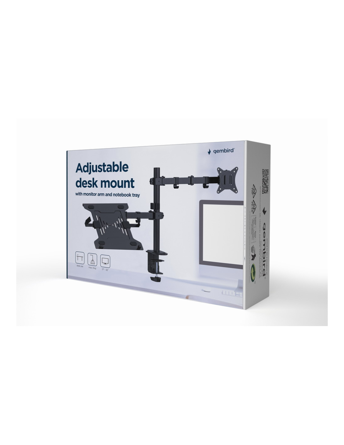 Gembird MA-DA-03. Montaje: Pinza/Atornillado, Capacidad máxima de peso: 18 kg, Tamaño mínimo de pantalla: 43,2 cm (17"), Tamaño máximo de pantalla: 81,3 cm (32"), Compatibilidad con interfaz de montaje (min): 75 x 75 mm, Compatibilidad con interfaz de montaje (max): 100 x 100 mm. Ajustes de altura, Ángulo de giro (alcance): -90 - 90°, Ángulo de inclinación: -45 - 45°. Color del producto: Negro