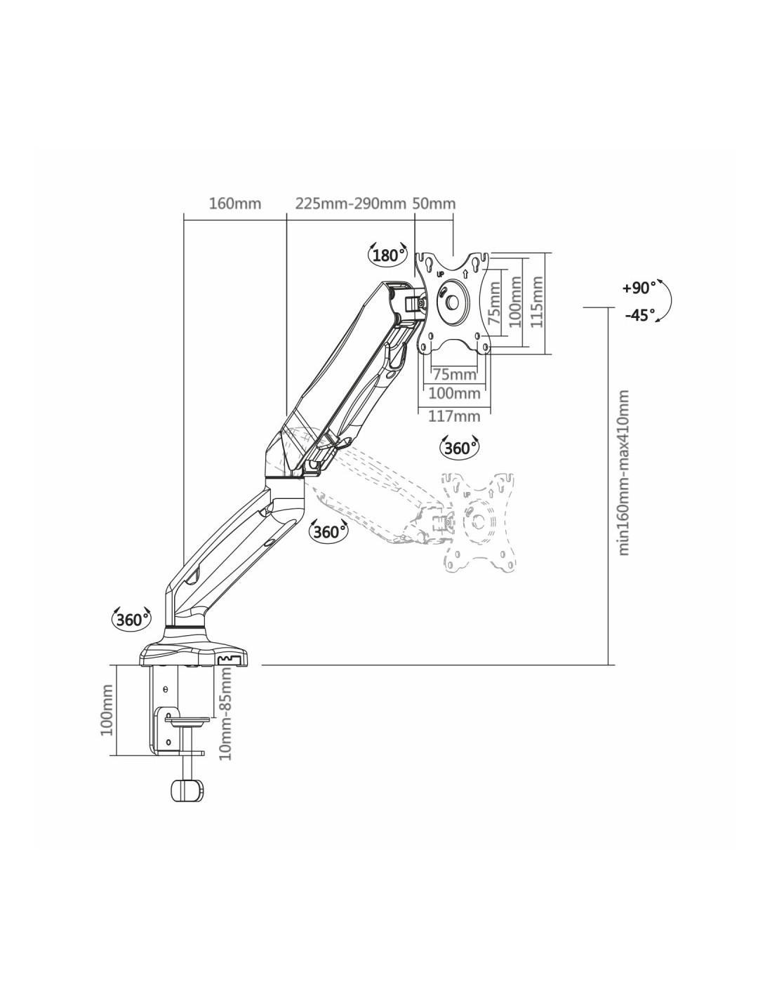 El peso de la pantalla tiene que estar entre 2kgs y 9kgs. Si la pantalla tiene un peso inferior a 2kgs el brazo siempre subirá solo y si por el contrario es superior a 9kgs siempre bajará solo. Eso significa que la pantalla no puede trabajar con este soporte.