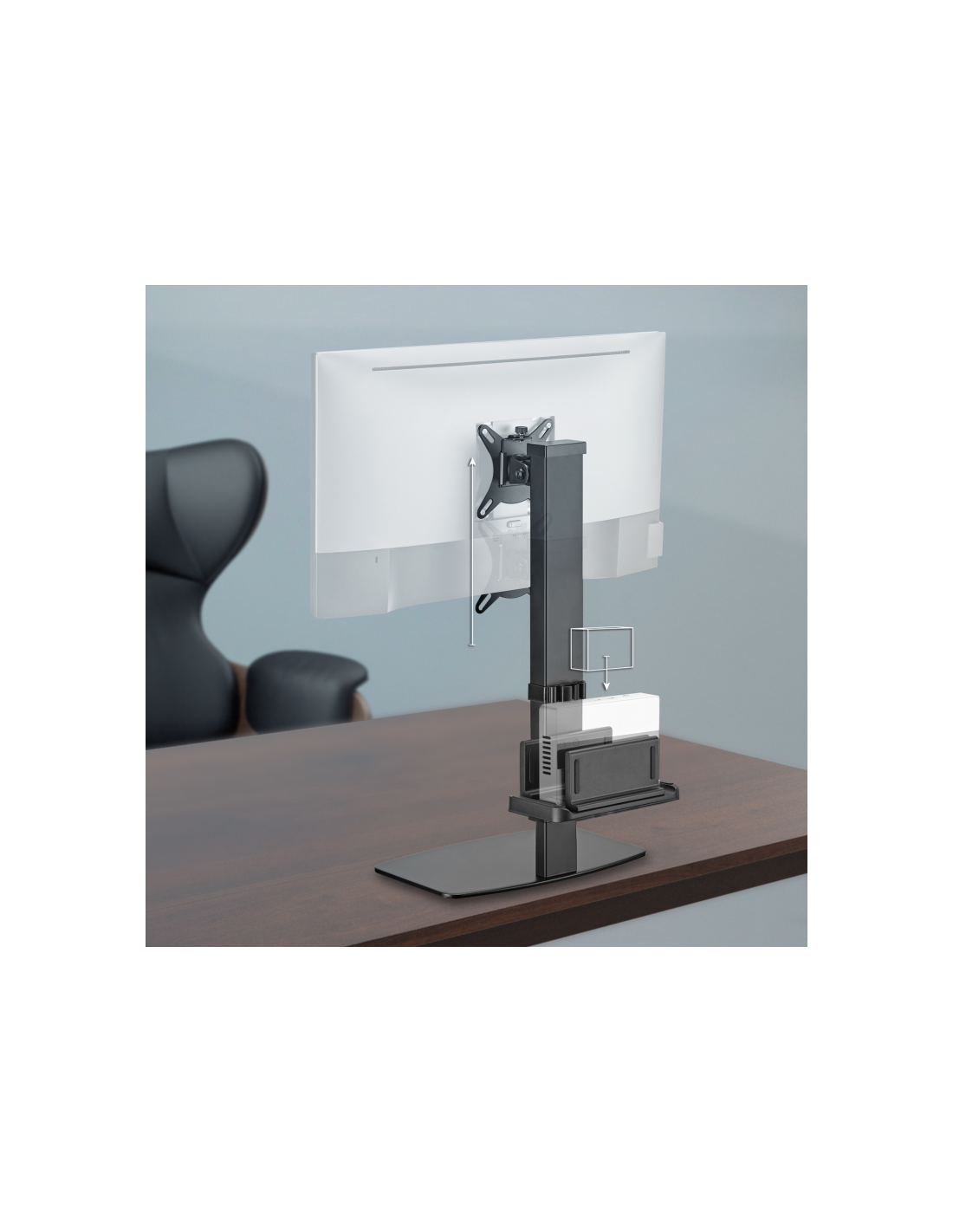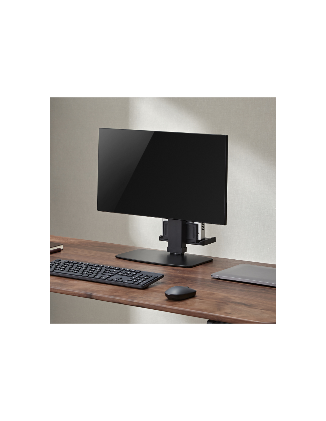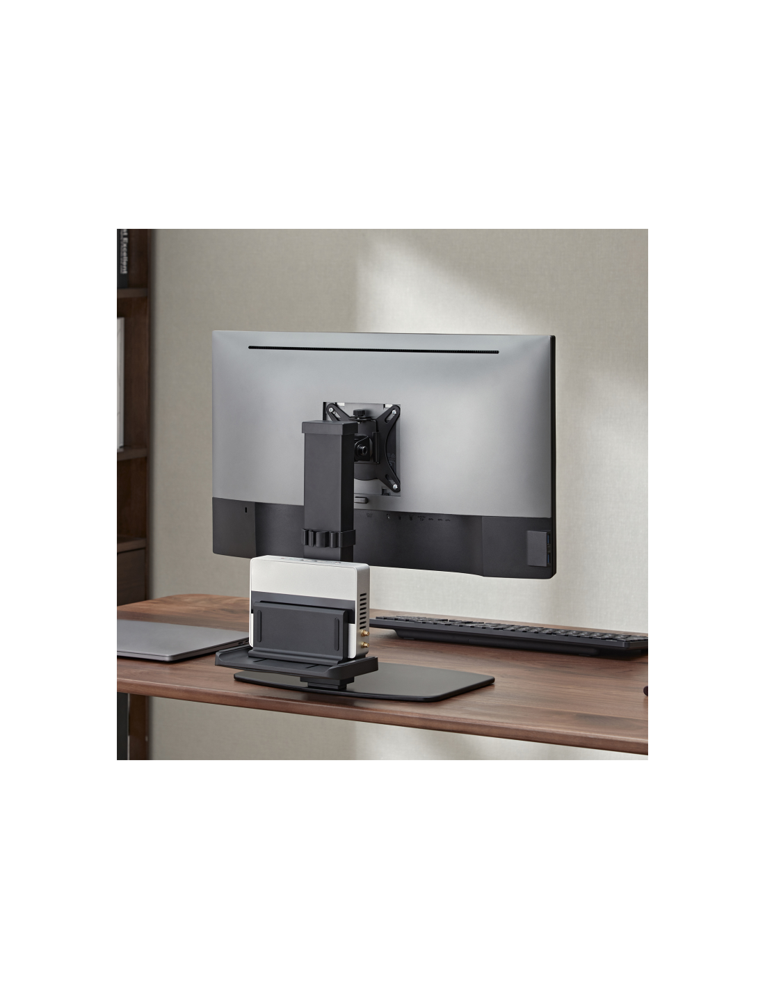 Este soporte para monitor cuenta con una característica adicional que lo hace aún más práctico: un soporte para mini PC en su parte posterior. De esta manera, no solo podremos elevar la pantalla a una altura cómoda, sino que también tendremos más espacio libre en nuestra mesa para trabajar de manera más eficiente. ¡Es una forma práctica y ordenada de mejorar nuestro espacio de trabajo!