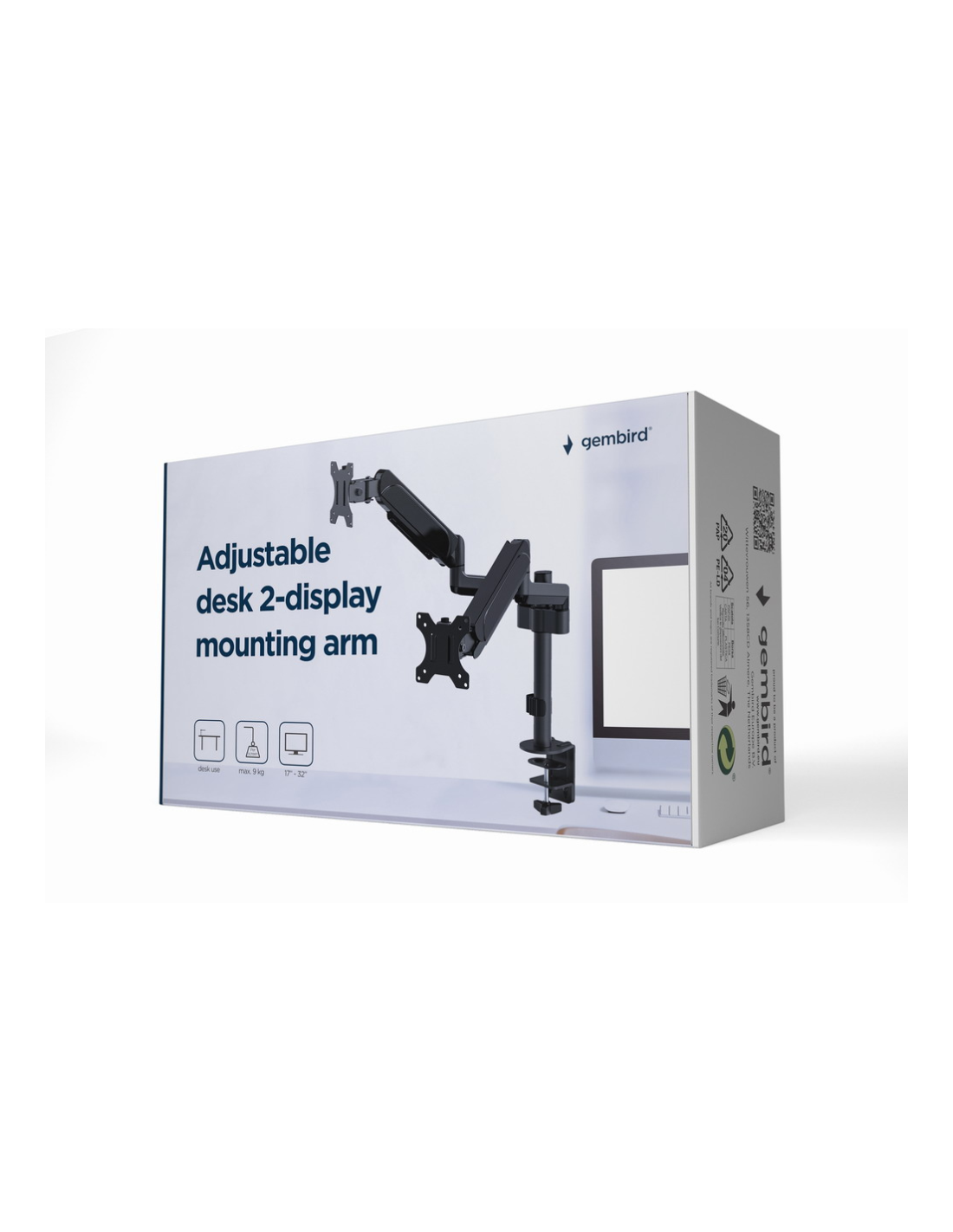 Gembird MA-DA2P-01. Montaje: Pinza/Atornillado, Capacidad máxima de peso: 18 kg, Tamaño mínimo de pantalla: 43,2 cm (17"), Tamaño máximo de pantalla: 81,3 cm (32"), Compatibilidad con interfaz de montaje (min): 75 x 75 mm, Compatibilidad con interfaz de montaje (max): 100 x 100 mm. Ajustes de altura, Ángulo de giro (alcance): -90 - 90°, Ángulo de inclinación: -35 - 35°. Color del producto: Negro