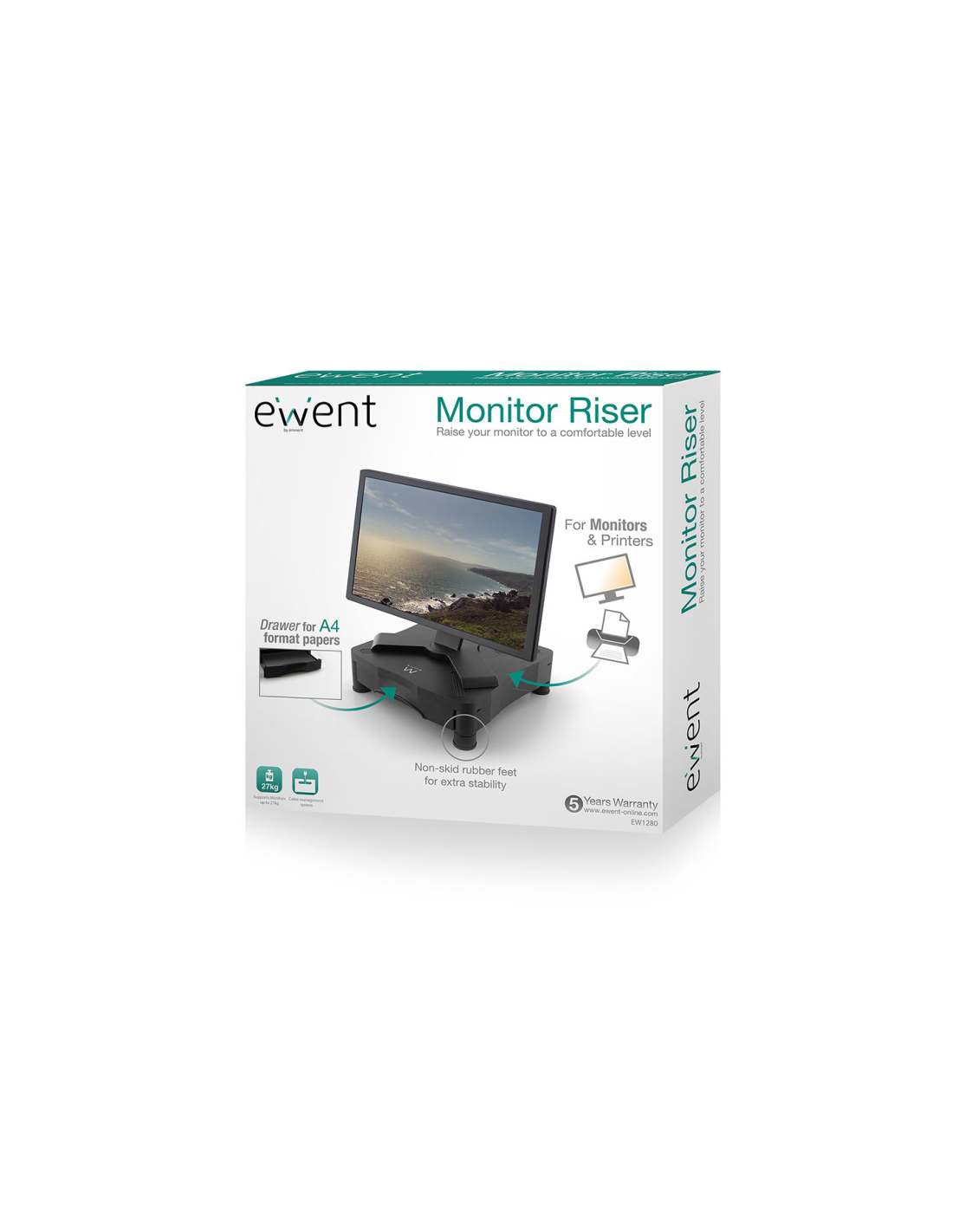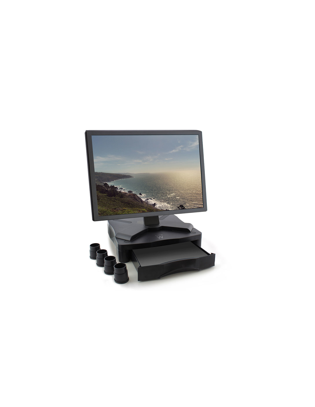 El Elevador de Monitor EW1280 eleva su monitor a una altura cómoda para usted. Organice sus cables con el sistema de cableado. En su útil cajón podrá almacenar sus folios A4 y su material de escritorio. Sus patas de goma antideslizantes garantizan la estabilidad del Elevador de Monitor.